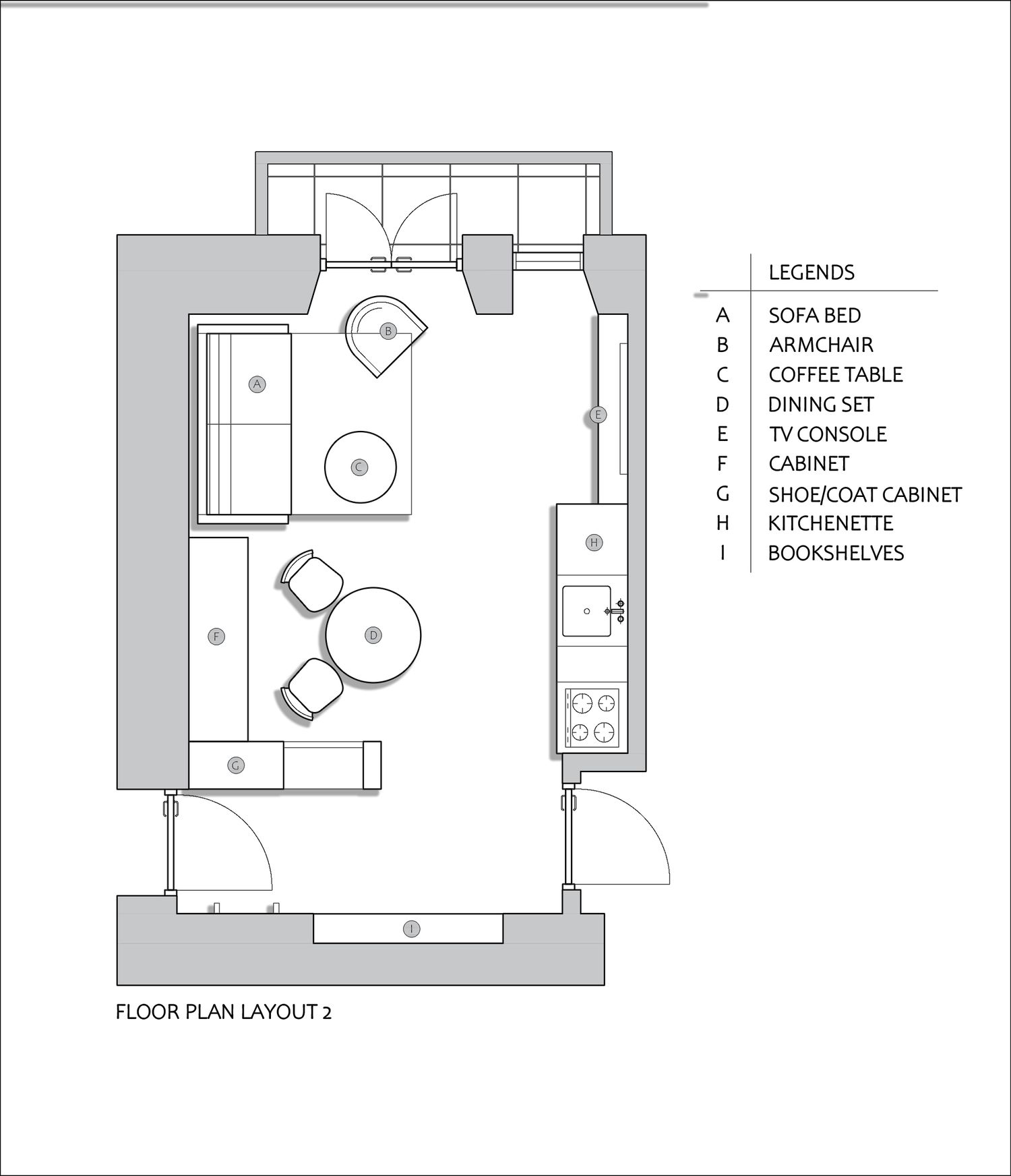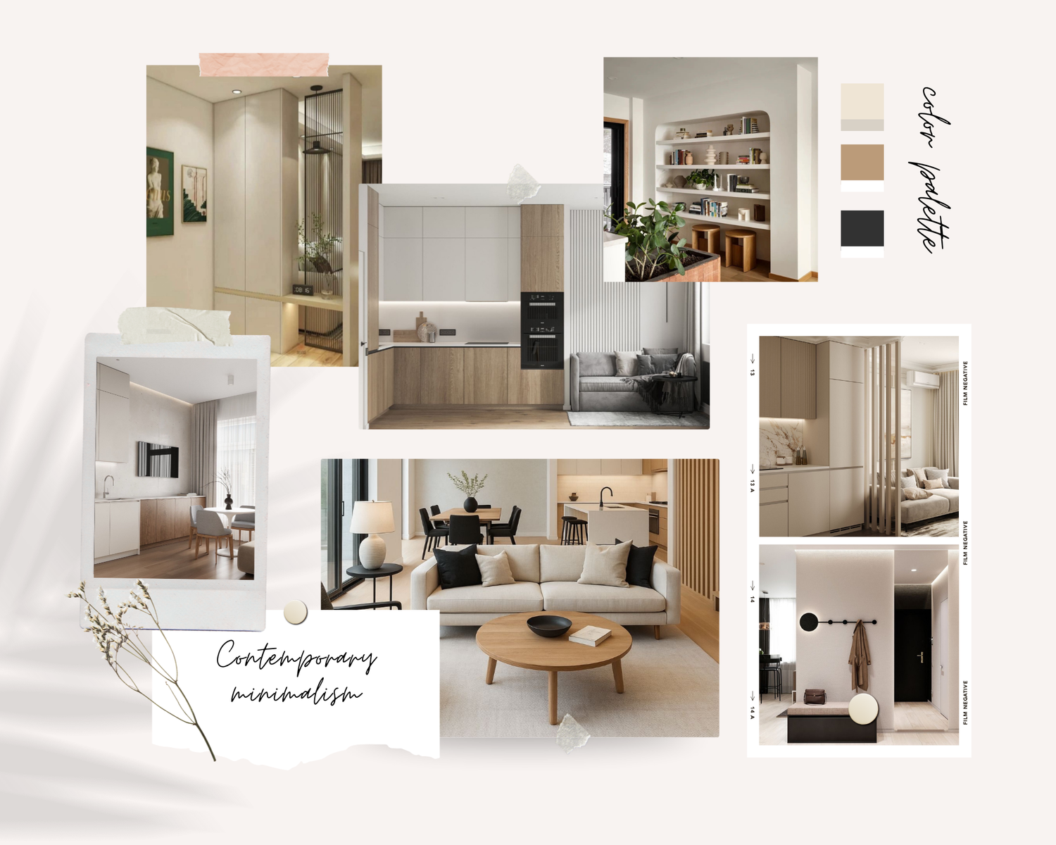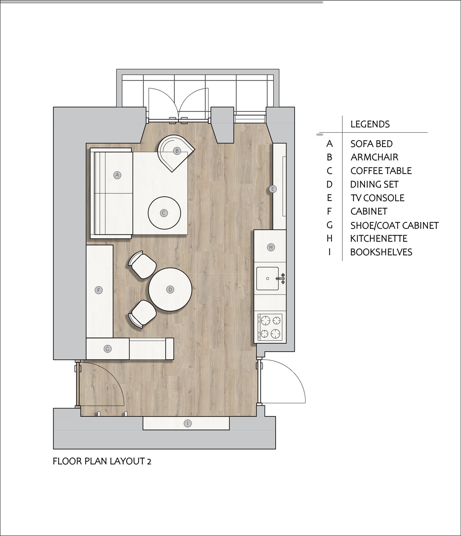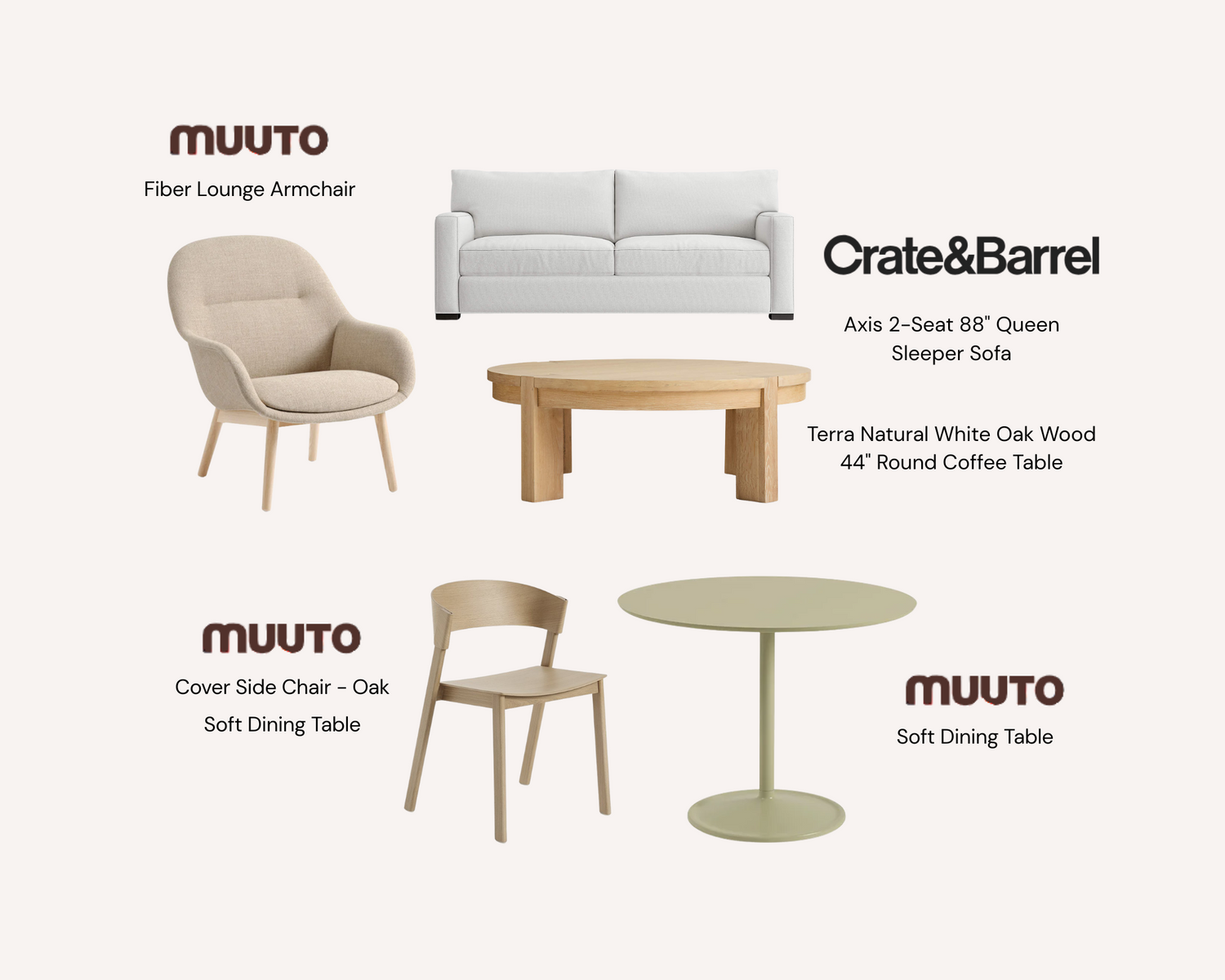 The living room with kitchenette is designed to be both functional and stylish, balancing personal comfort with Airbnb appeal. A modern palette of Mizzle, Skimming Stone, white, black, and Scallop creates a calm yet refined atmosphere, complemented by subtle wall paneling and moldings. Adaptable furniture such as a sofa bed and bookcase maximize usability, while design lamps add sophistication without excess cost. The result is a space that feels inviting, practical, and memorable for both the owner and guests. With 3 plan options for your comments and review thanks
