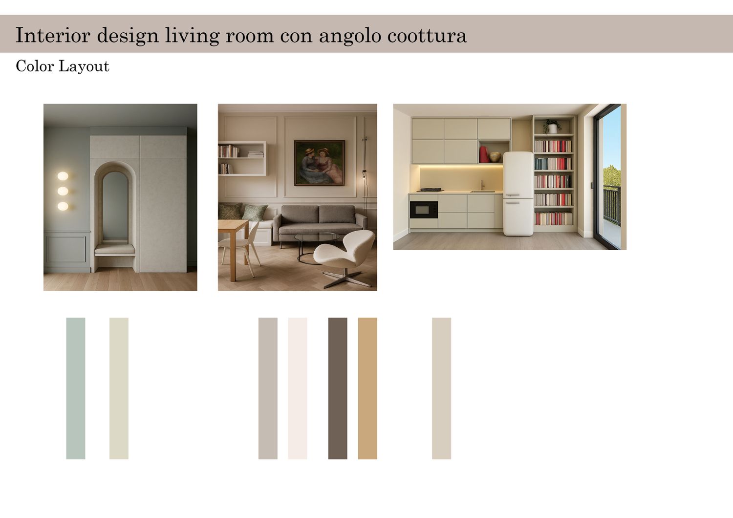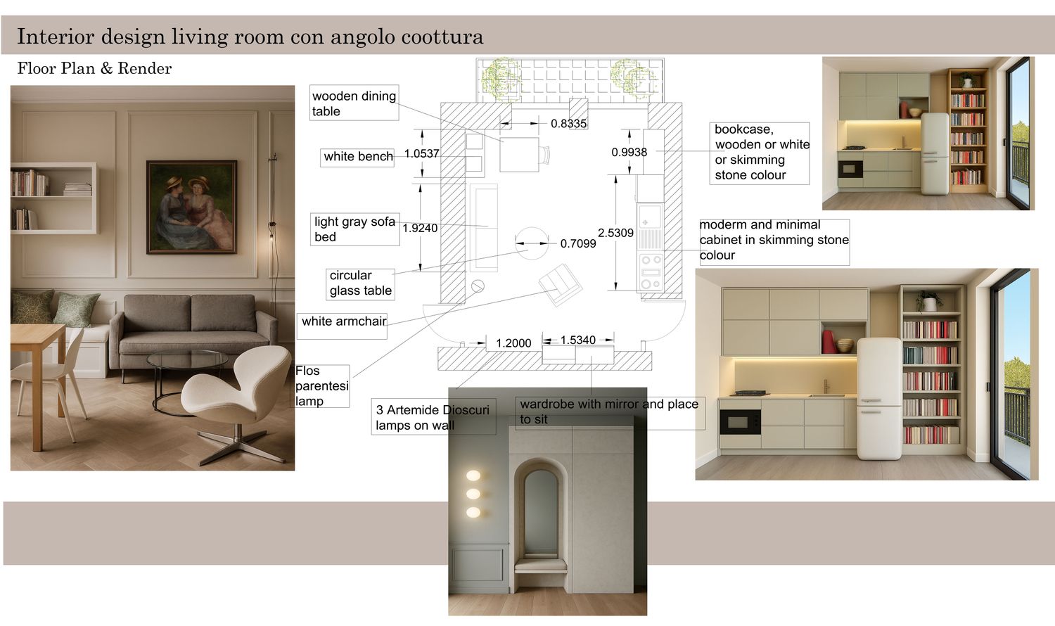 I tried to design a small living room and kitchen based on your needs and desires. Based on your favorite colors. A small wardrobe with a place to sit is located on the lower wall. A modern and simple cabinet with kitchen utensils and a bookcase next to it. Facing this wall is a simple bench with a dining table and next to it a sofa bed and an armchair. I hope you like the design.