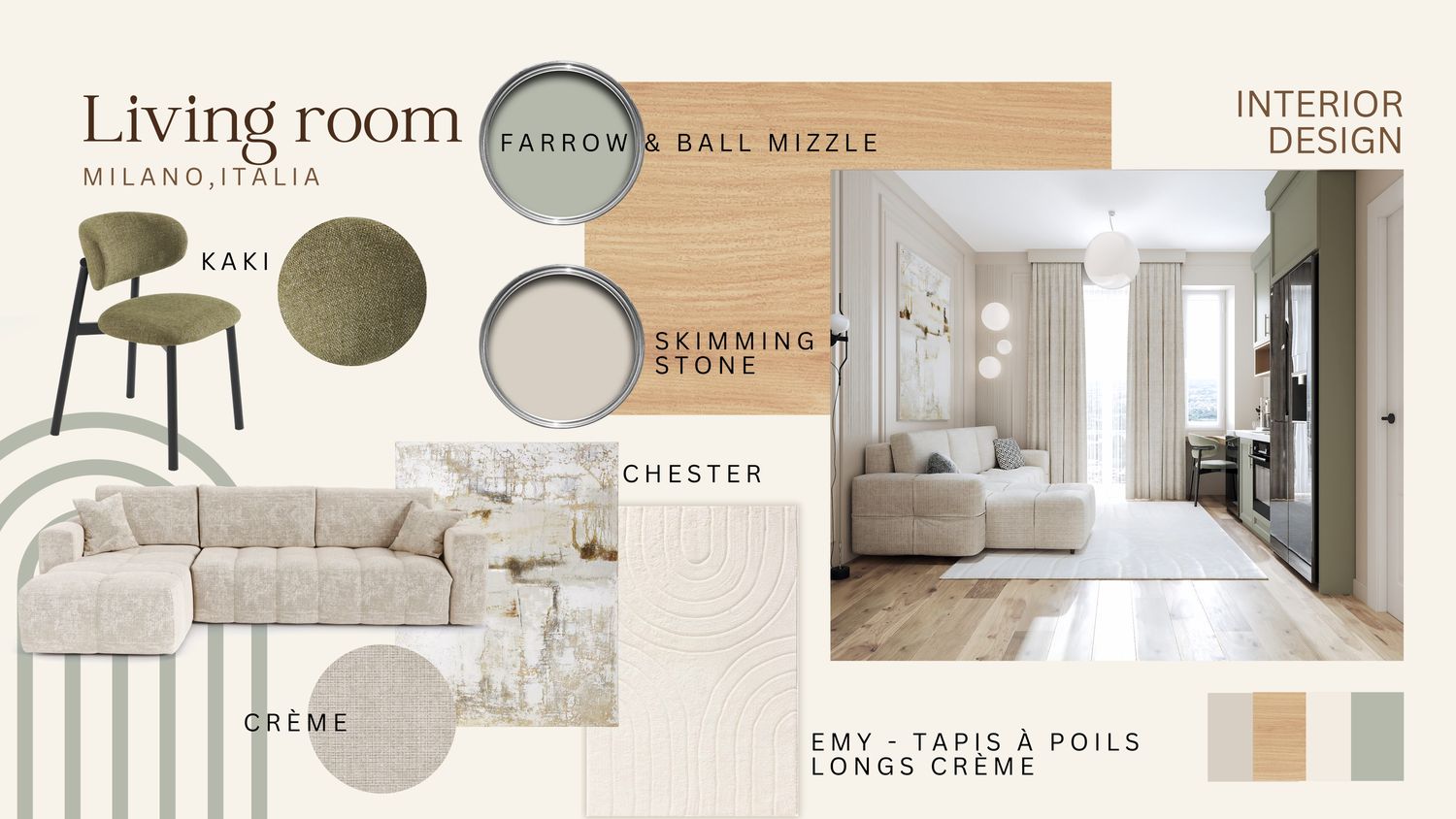 The **color palette—Mizzle, Skimming Stone, white, and black—**establishes a refined harmony, while wall paneling and moldings add architectural depth and sophistication without overwhelming the compact proportions.