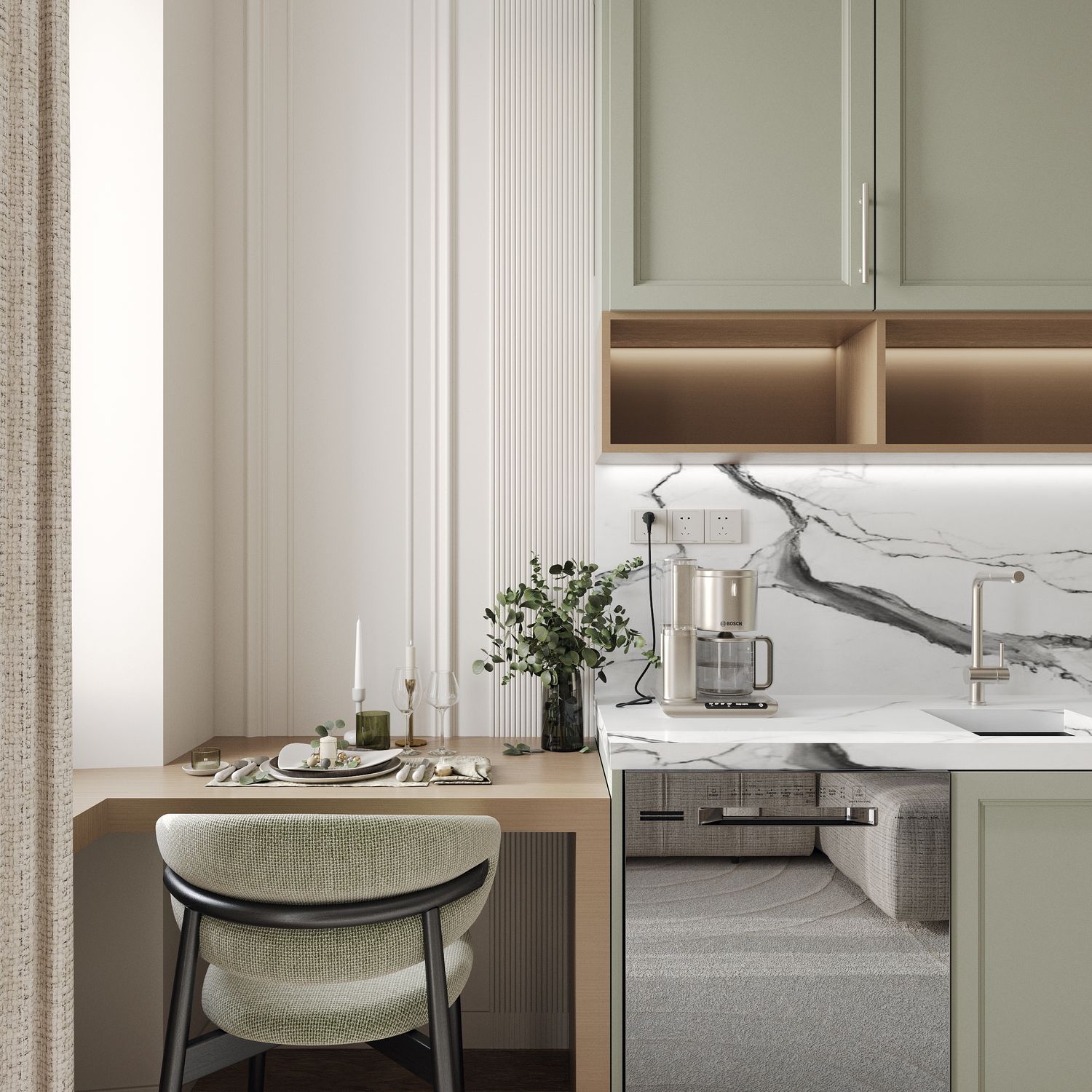 The layout is centered around a sofa bed, which provides flexibility between relaxation and sleeping use. The kitchenette in Farrow & Ball Mizzle green becomes the visual anchor of the space, paired with a marble backsplash and an integrated dining corner that allows efficient use of every centimeter.