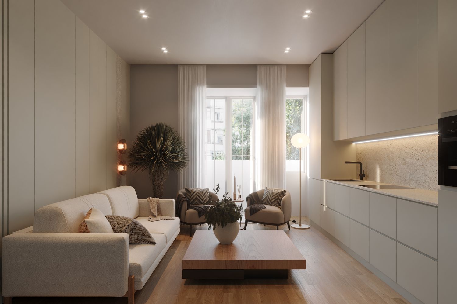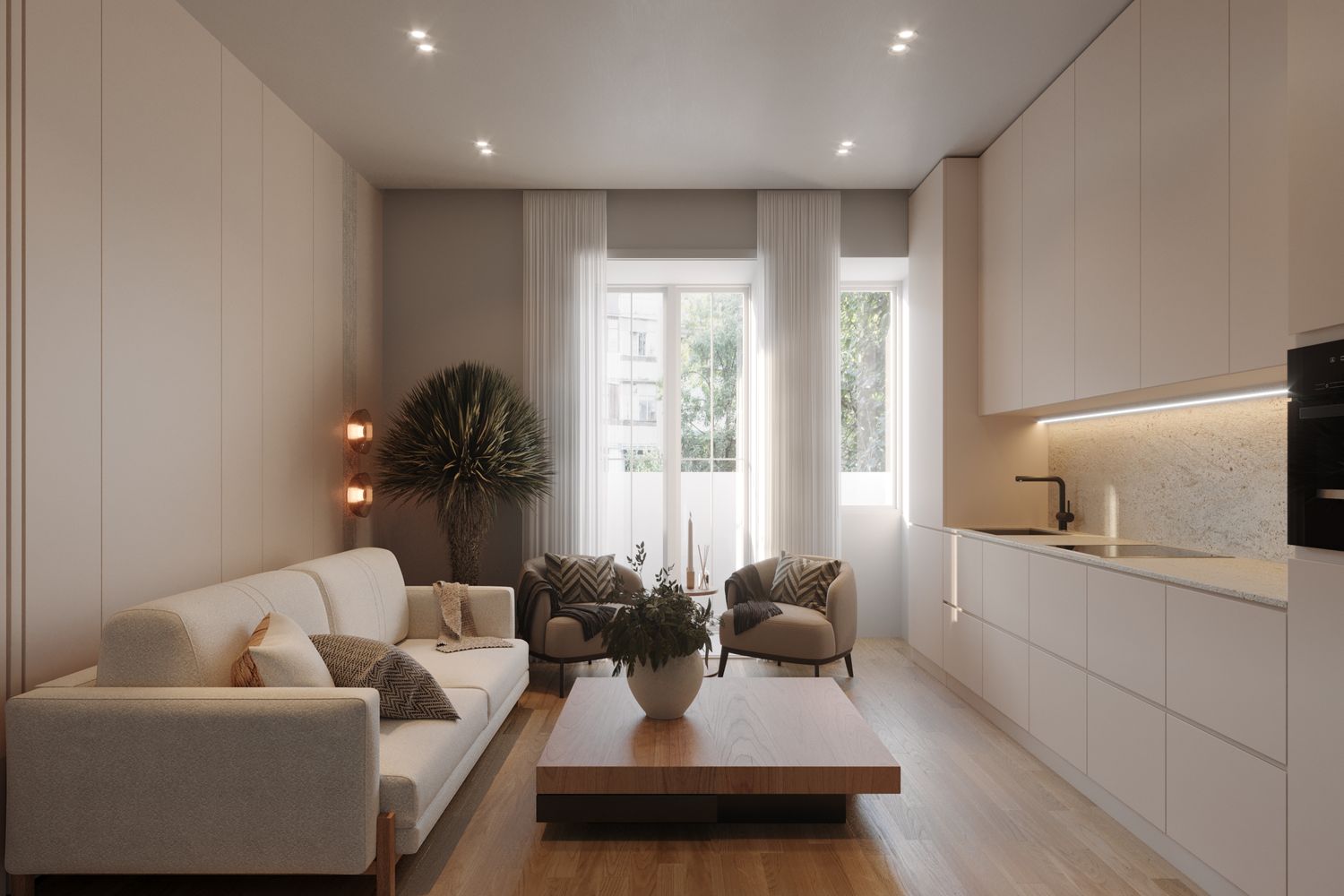 La zona living comprende un divano a tre posti IKEA e due poltrone singole.