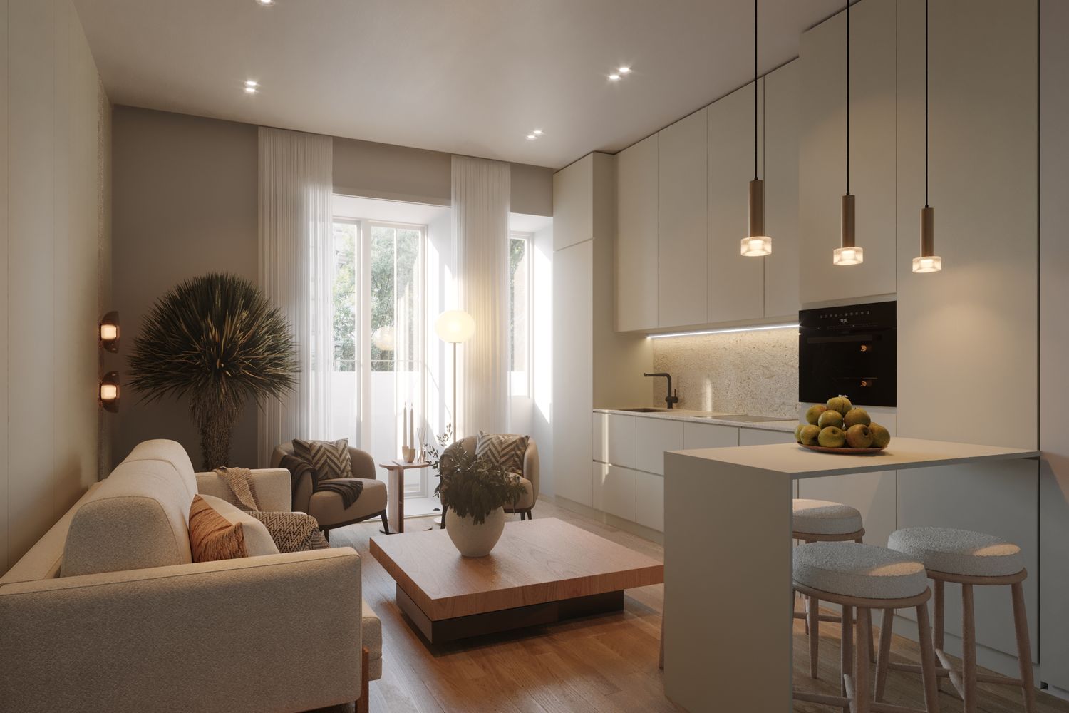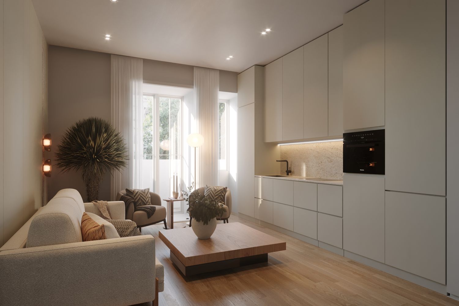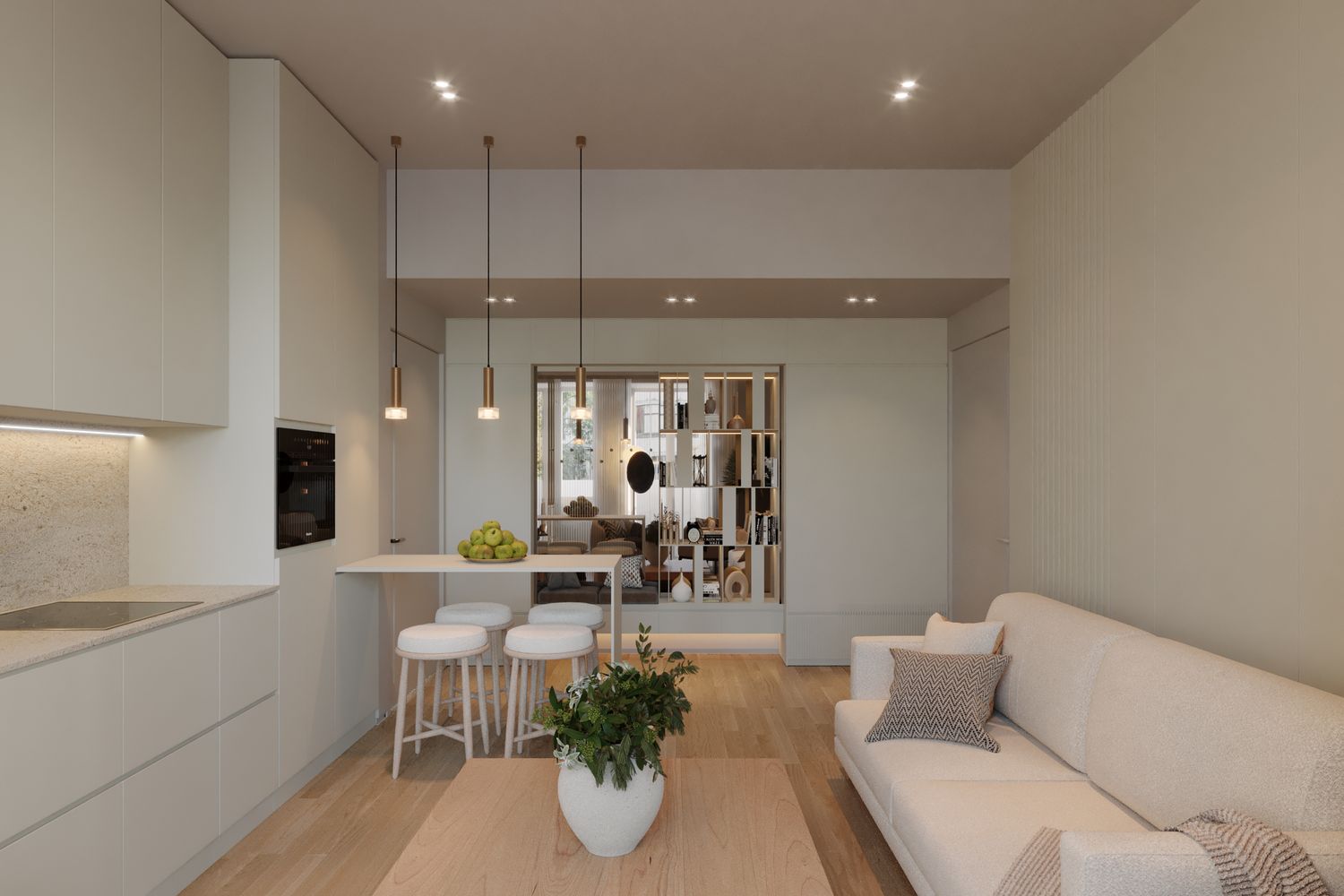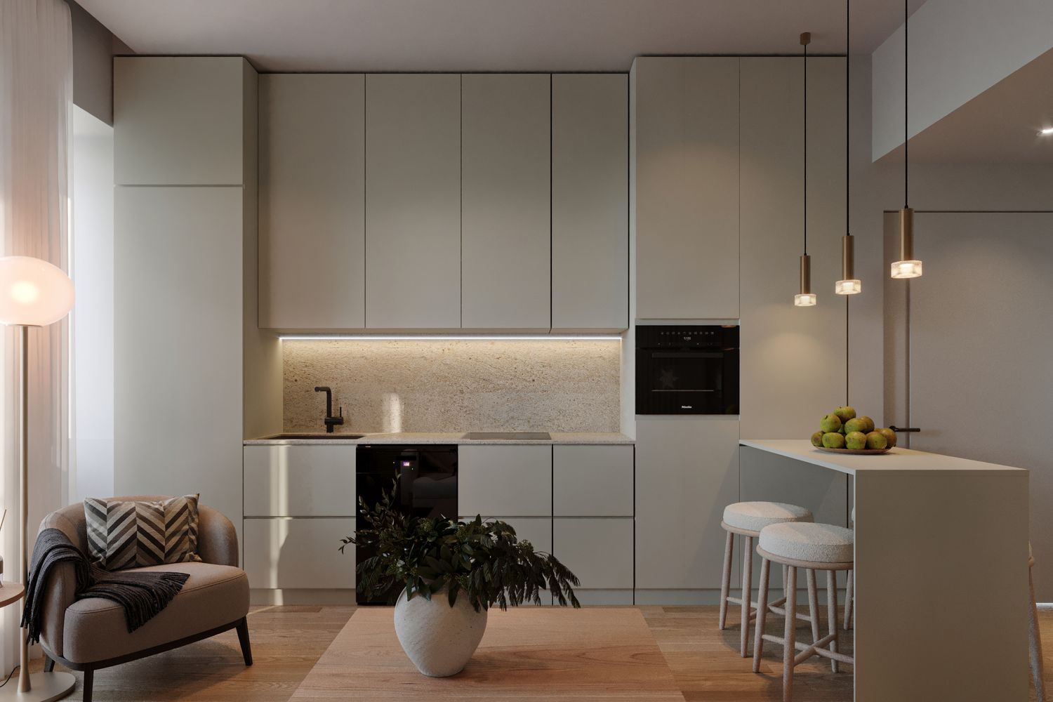 Nel mio design ho dedicato uno spazio alla cucina, molto minimale, piccola e lineare. Ho inserito un frigorifero a incasso accanto alla finestra, con il microonde sul lato destro, e ho aggiunto un bancone per la zona pranzo.