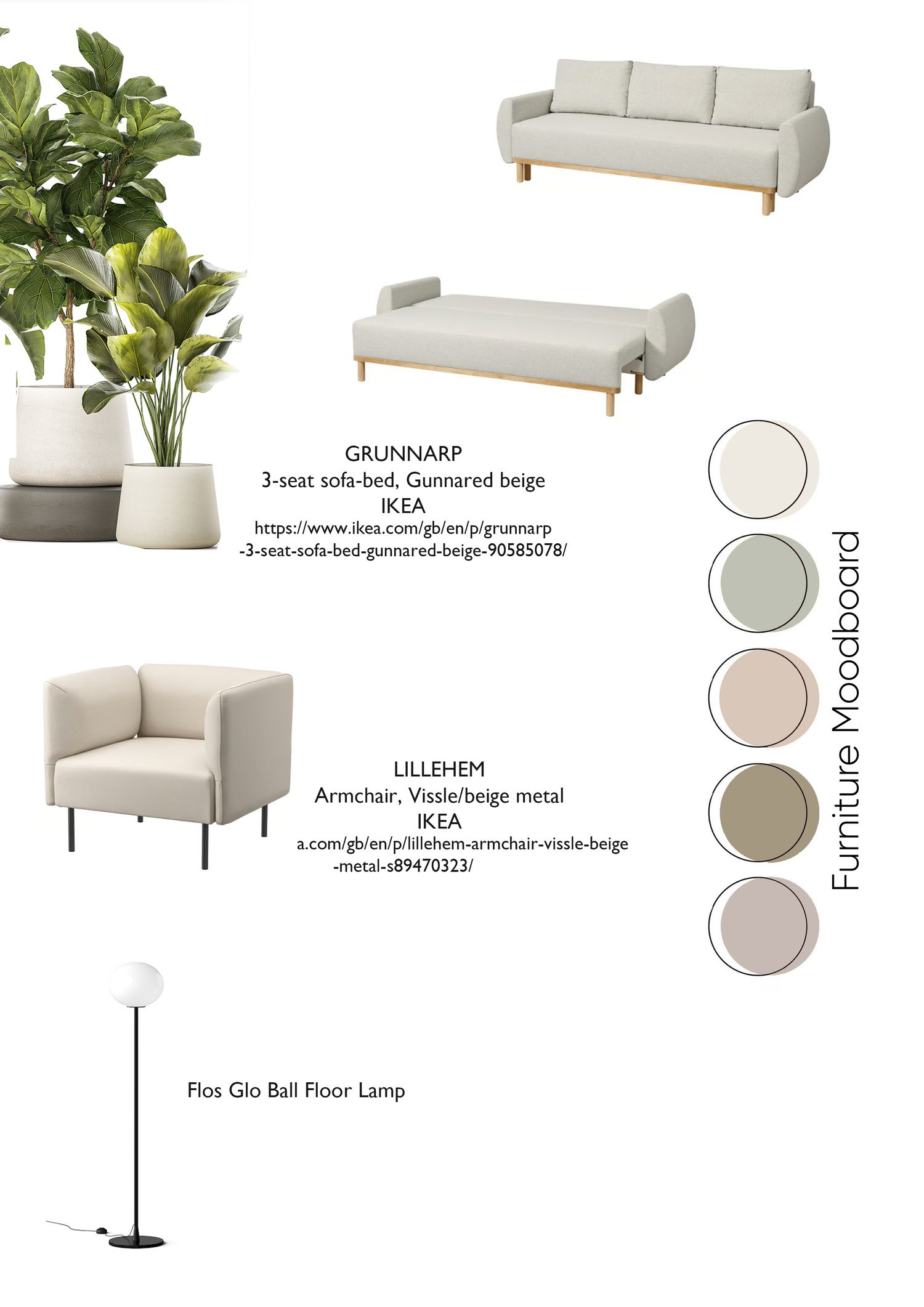 The living area includes an IKEA three-seater sofa and two single armchairs.