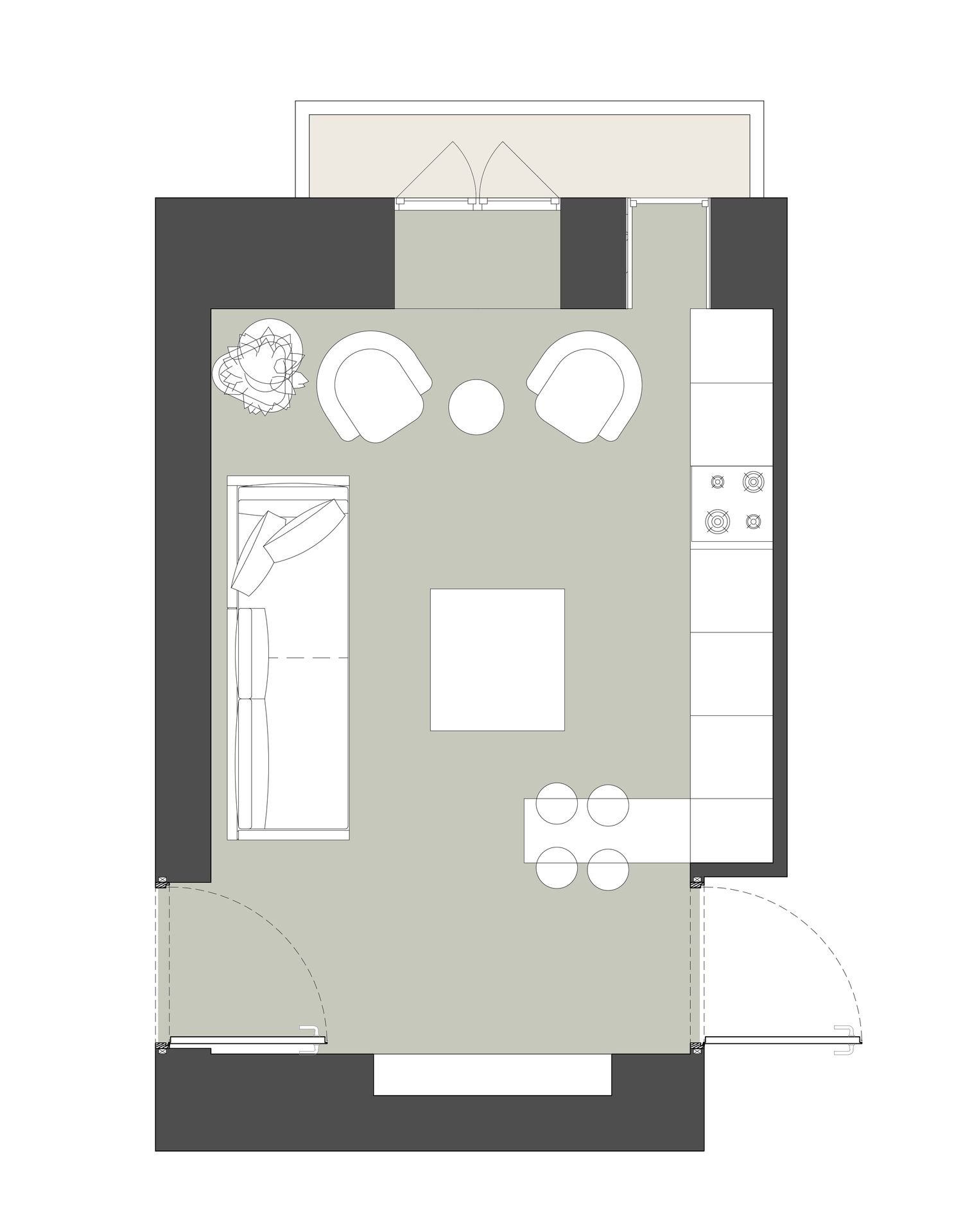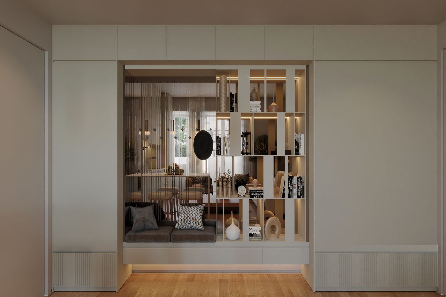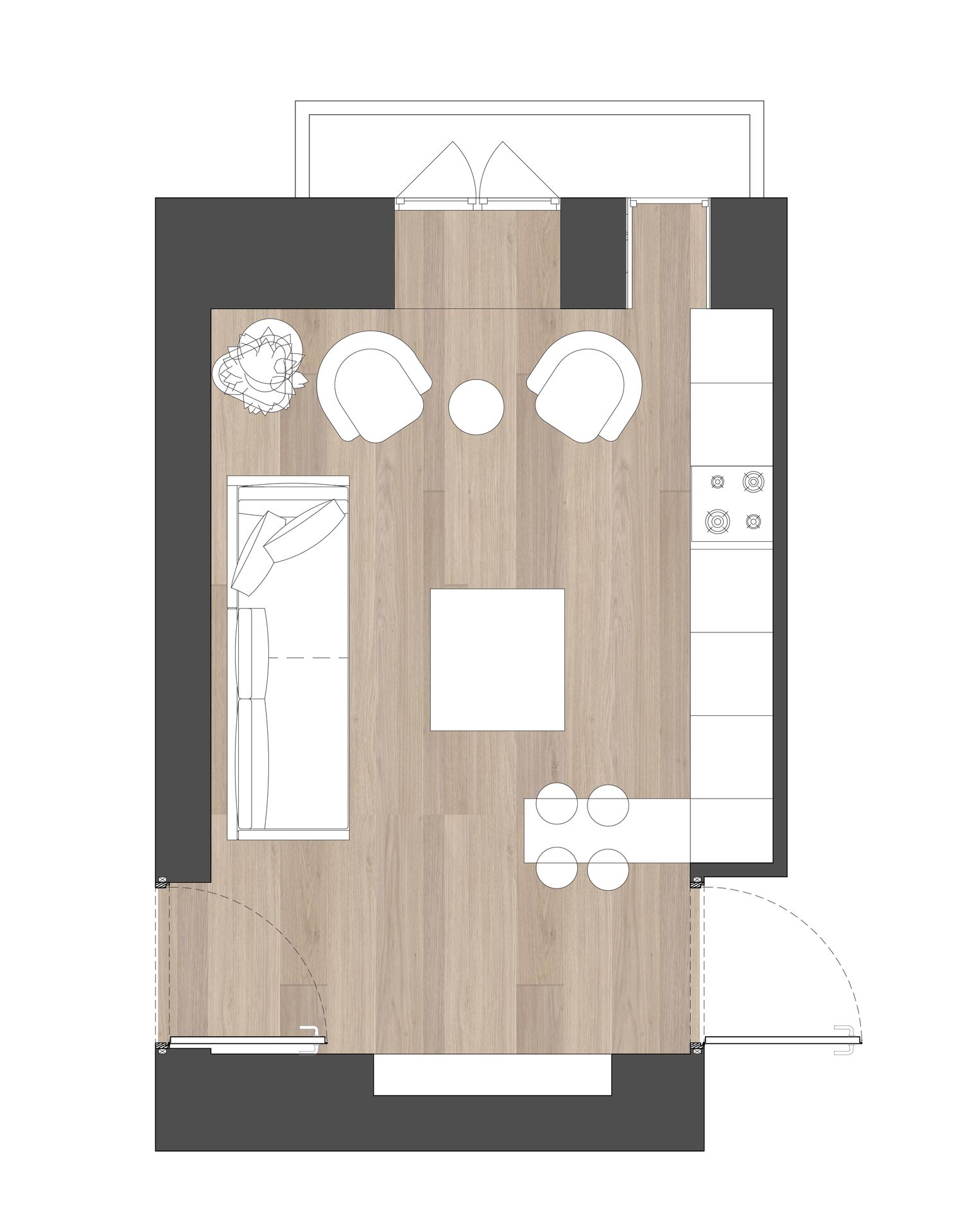 In my design, I dedicated a space to the kitchen, which is very minimal, small, and linear. I placed a built-in refrigerator next to the window, with the microwave on the right side, and added a counter for dining.