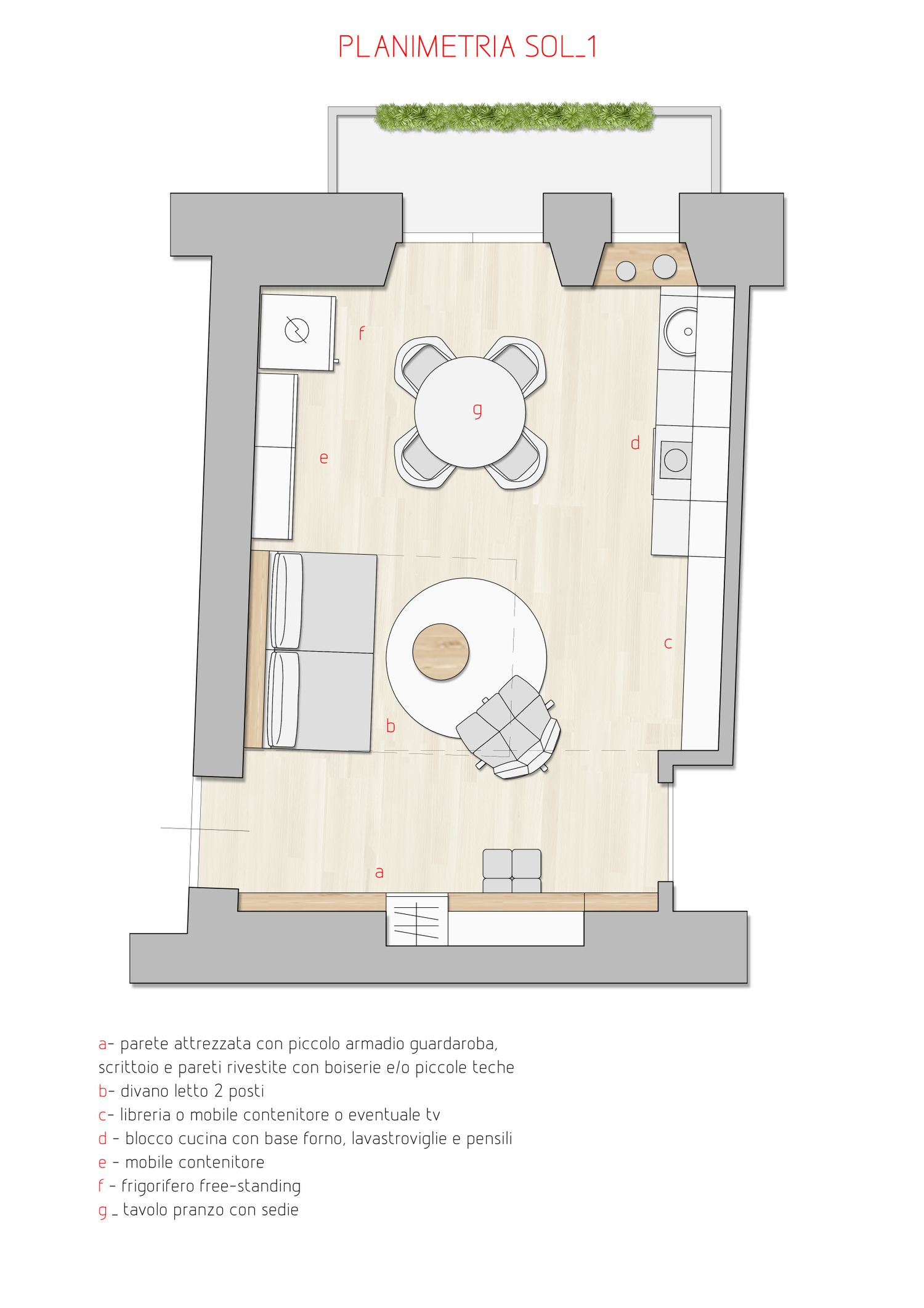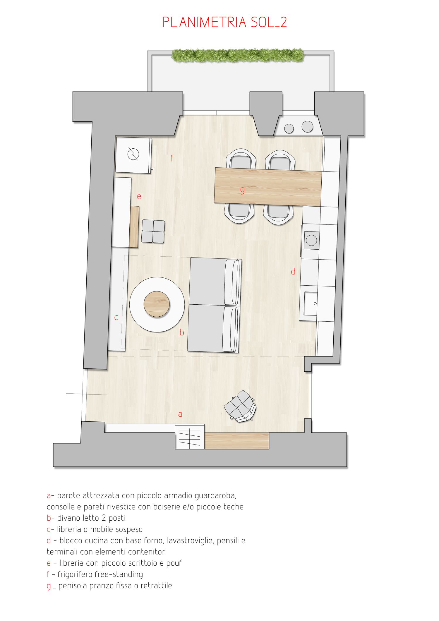 Il progetto nasce da un attento studio degli spazi in modo da ottimizzare tutti gli angoli del living così da poter ospitare quanto richiesto. Entrando siamo accolti da una consolle svuota tasche che termina con un mobile per i cappotti, per poi avere il divano letto con parete attrezzata con mobile minimale tv, cucina completa di tutto il necessario e tavolo pranzo con possibilità di essere allungato e sfruttato come penisola della cucina. Gli arredi sono semplici e lineari con colori neutri e contrasti più scuri per dare risalto ai dettagli.