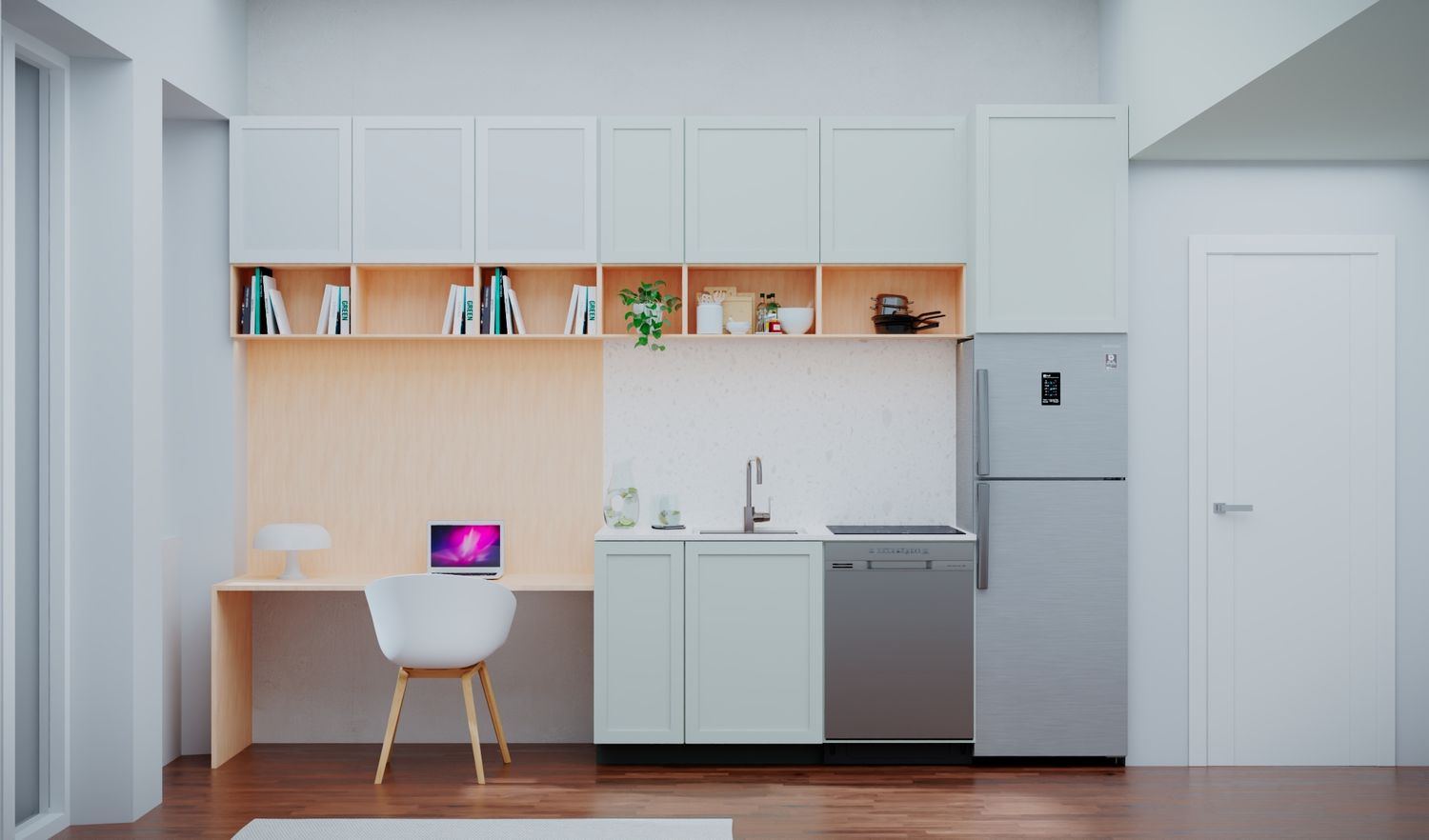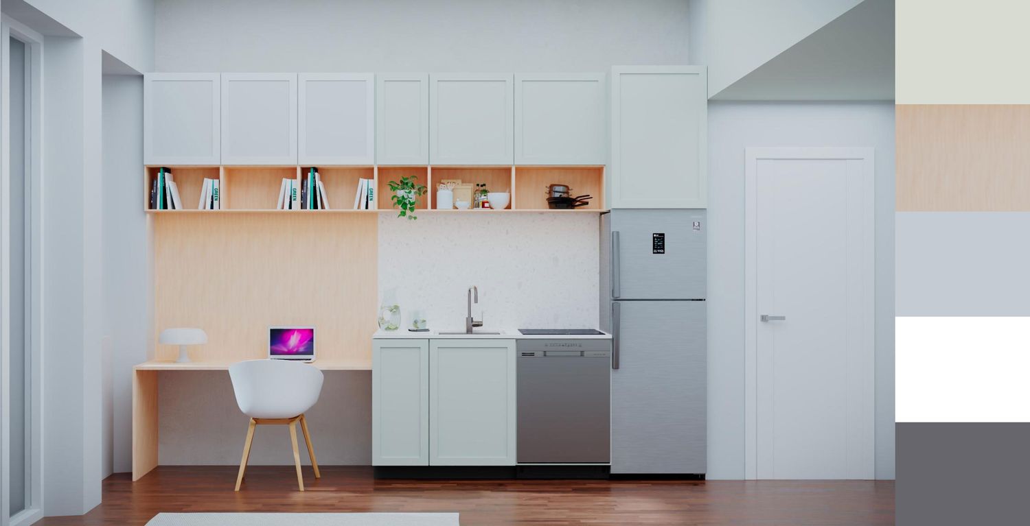 Ho cercato di integrare la parete della cucina con l’area lavoro, creando una soluzione compatta e funzionale. I pensili chiari aumentano la luminosità, mentre l’uso del legno porta calore e naturalezza.