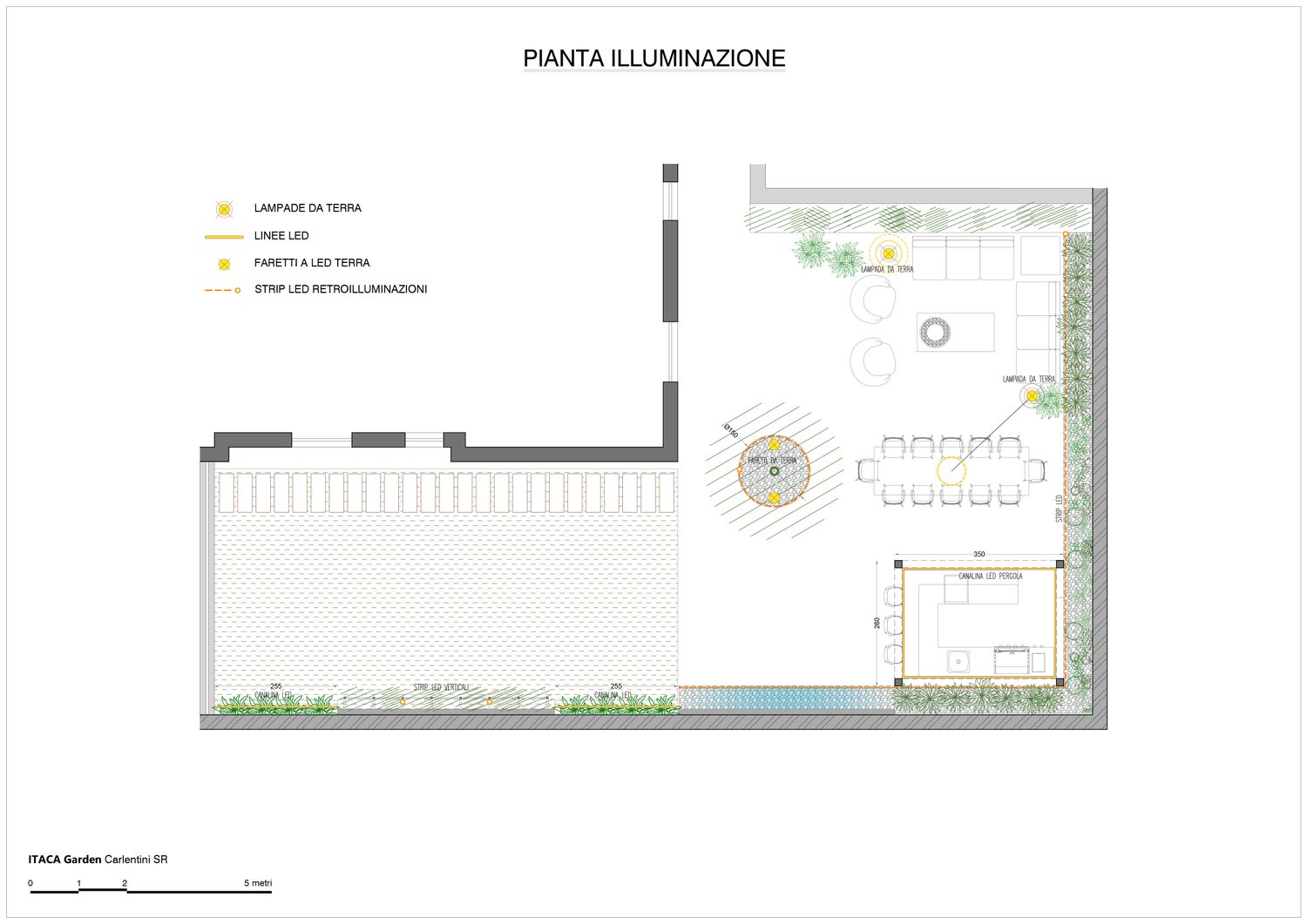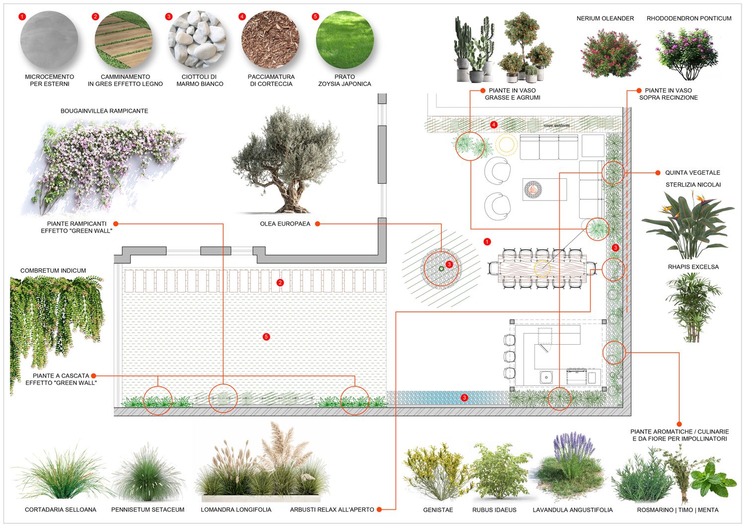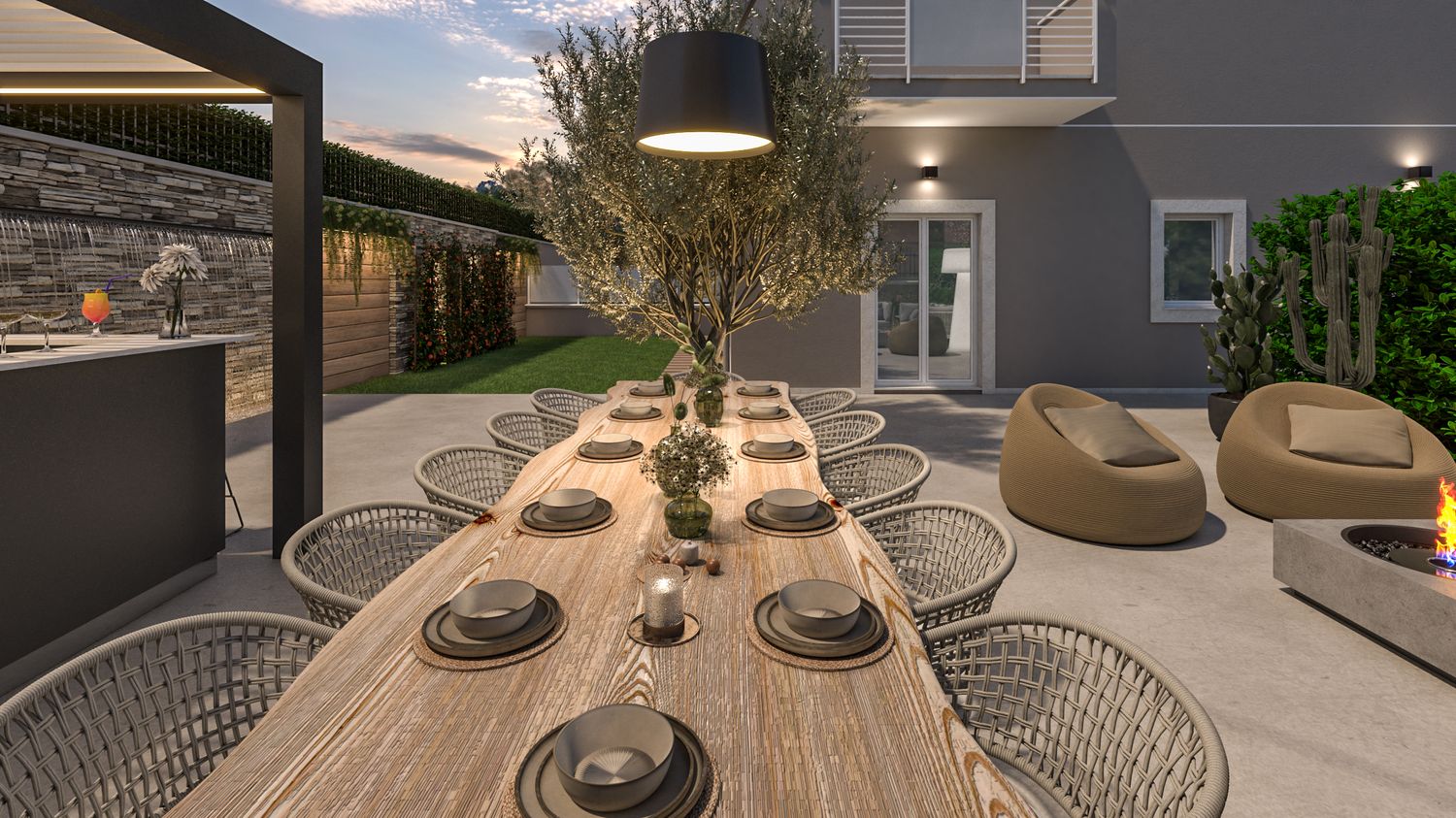 Illuminazione & Benessere: Studio illuminotecnico scenografico per vivere lo spazio 24h (luci soffuse, wall grazing). Le essenze arboree sono state selezionate specificamente per il comfort visivo e olfattivo.