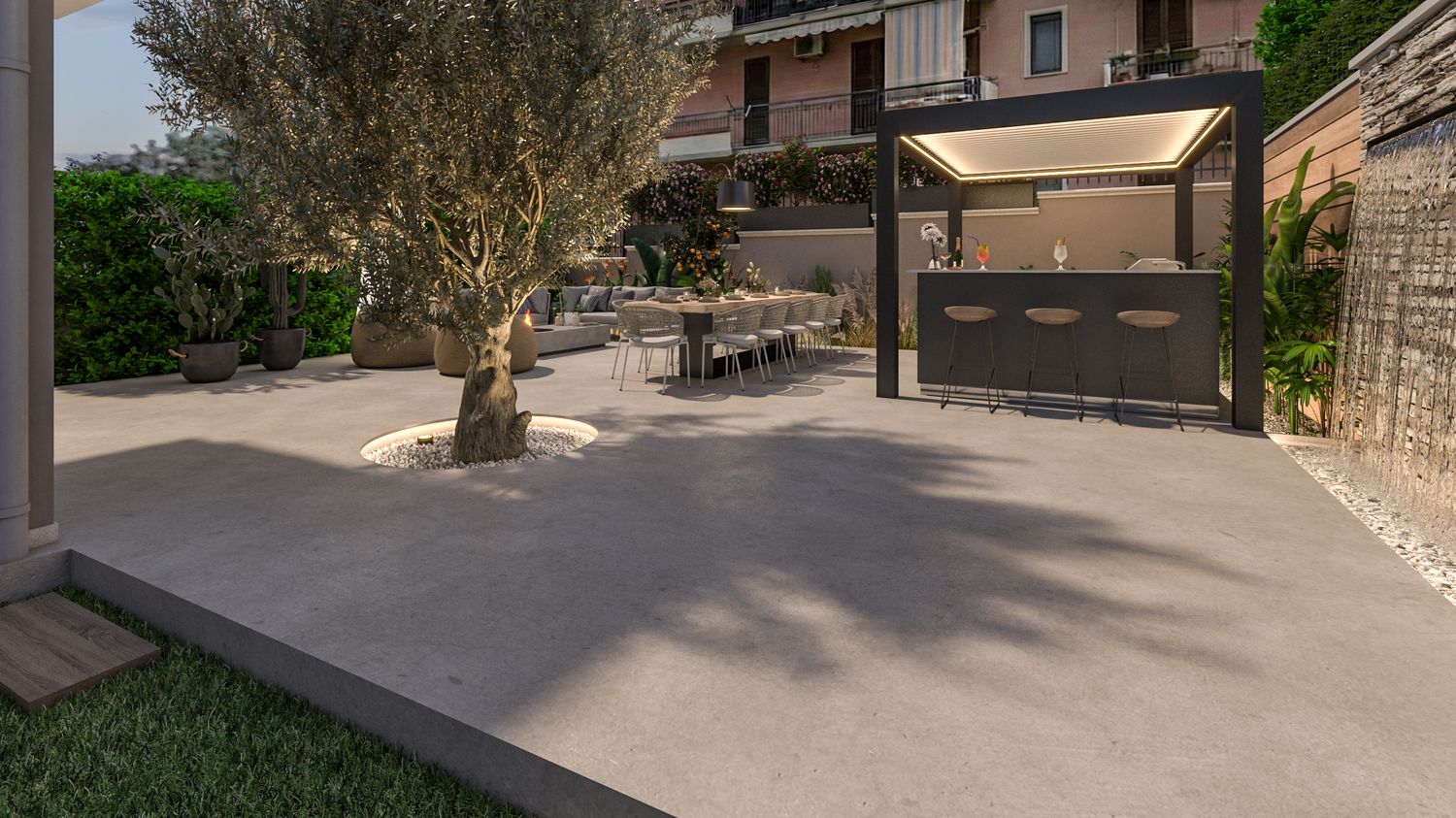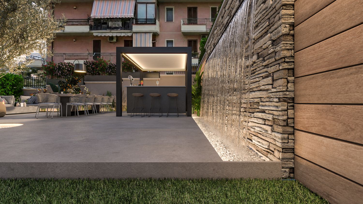 Elemento Wow: A fare da cerniera tra l'area pavimentata e il giardino, una parete scenografica rivestita in pietra naturale con lama d'acqua. Oltre all'impatto visivo, esaltato dall'illuminazione radente, la cascata crea un sottofondo sonoro rilassante che isola acusticamente l'oasi dal contesto urbano.