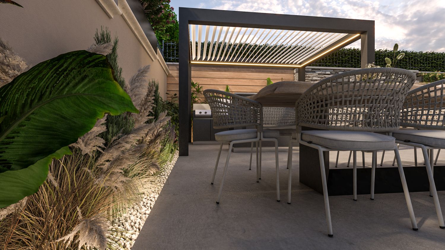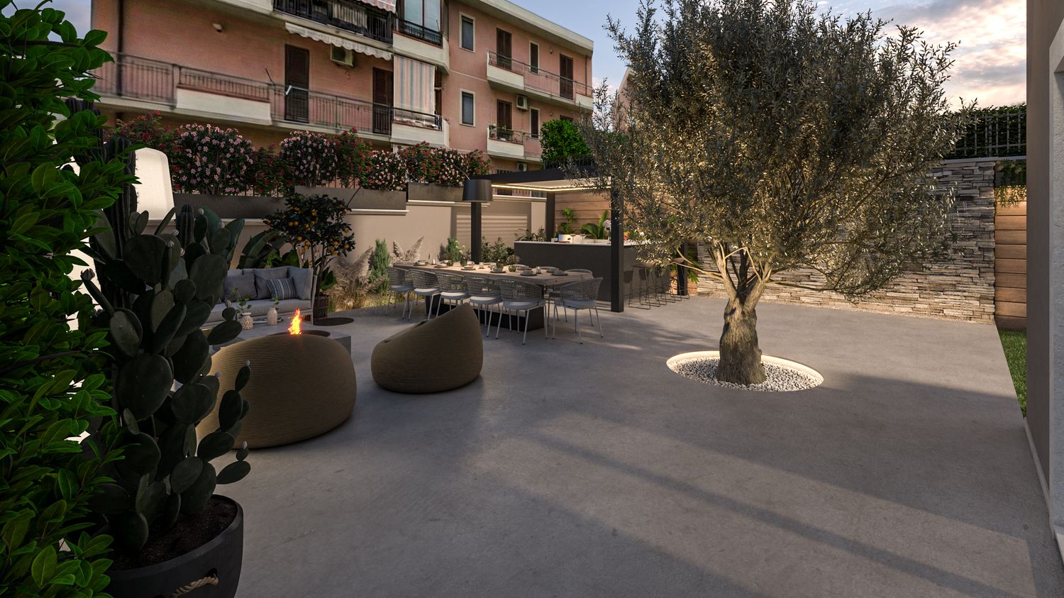 Trasformazione di un giardino privato in un'estensione della zona living: un design minimalista e materico che unisce il relax quotidiano all'intrattenimento.