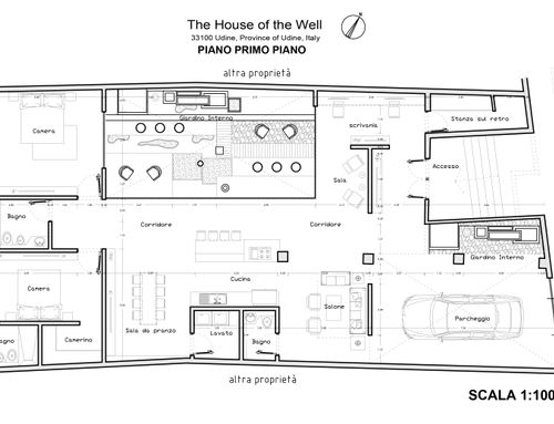 • Ai quattro lati del fabbricato si hanno: lato est marciapiede/strada pubblica; lato sud parete in condivisione con altra proprietà (sono presenti finestre); lato ovest uscita su giardino di altra proprietà; lato nord parete in condivisione con altra proprietà (sono presenti lungo tutto il confine garage e cantine);