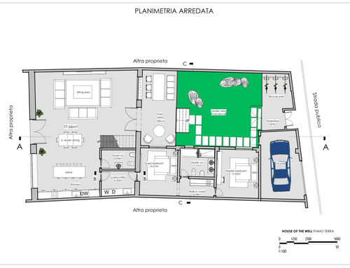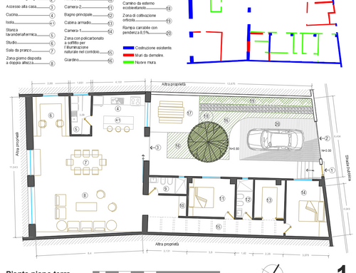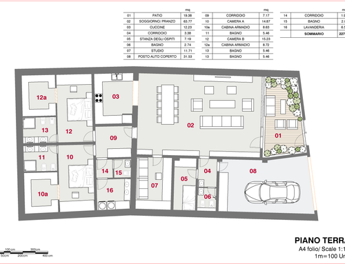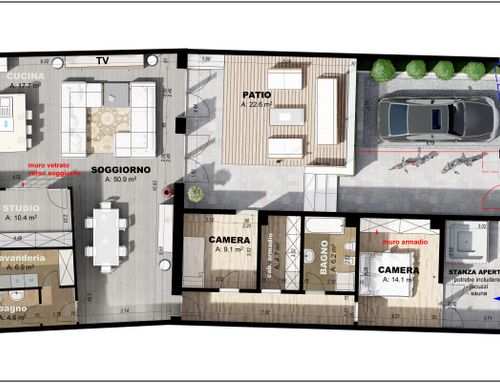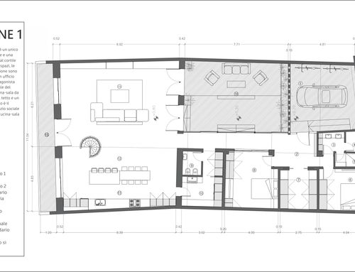 • Zona giorno disposta a doppia altezza con recupero del tetto a vista, soggiorno e cucina open space; piccolo studio; stanza lavanderia/termica;
