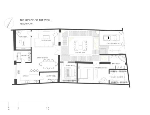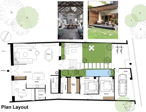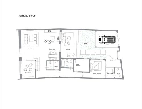 We would like a contemporary-style house with a spacious living area that has access to a small garden, 2 bedrooms, 2 bathrooms, a small study, laundry room, and a walk-in closet. The overall gross floor area on a single level is approximately 130/140 sqm.