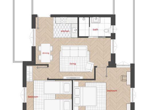 Occorre distribuire gli spazi sulla planimetria allegata, il bagno deve rimanere dov'è e la cucina deve essere accanto la parete del bagno, essendo lì gli scarichi.