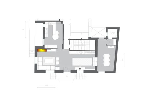 - Desde la ventana del área de la chimenea hasta la sala de estar, las escaleras son de 10,5 m.