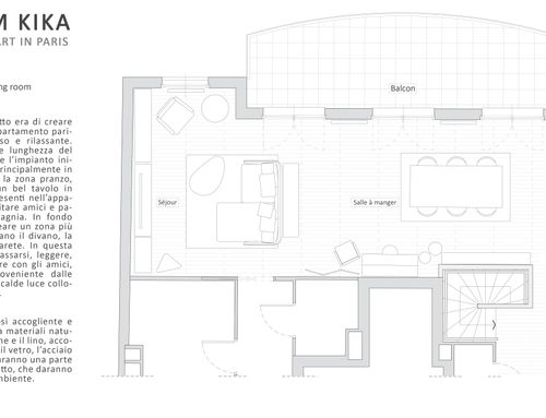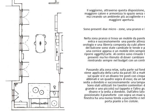 Vorrei rinnovare il mio salone che trovo troppo freddo, poco accogliente e cosy... Sono ormai 13 anni che é cosi e vorrei dargli un tocco piu femminile e caloroso. Vorrei uno stile piuttosto moderno e design perché é un appartamento cittadino. E' molto luminoso. Vorrei tenere lo stesso parquet perché é lo stesso in tutto l'appartamento. Penso che la luce sia molto importante e quella che ho non va bene. Vorrei anche segnalare il fatto che l'accesso all'appartamento si fa tramite una scala interna e quindi per i mobili bisogna fare attenzione perché non tutto puo' passare e non c'é nessun accesso esterno perché le finestre lato strada sono velux e quelle del soggiorno danno su una corte privata. Cucina aperta su soggiorno (da non modificare). Vorrei conservare il pianoforte, le sedie e eventualmente il tavolo. Budget: 10/15mila €