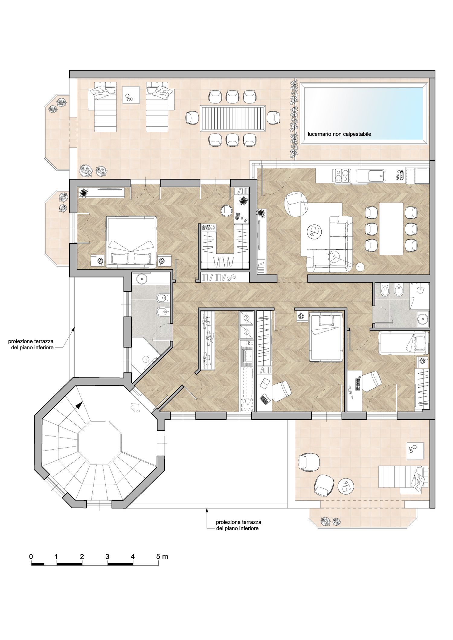 Le terrazze verranno arredate come naturale estensione del living e delle camere, con tavolo da esterno, divanetti lounge e poltroncine per creare area di convivio e relax.