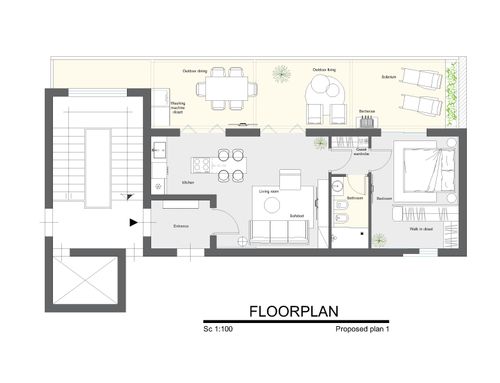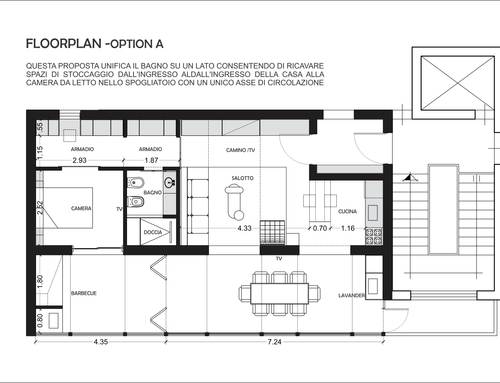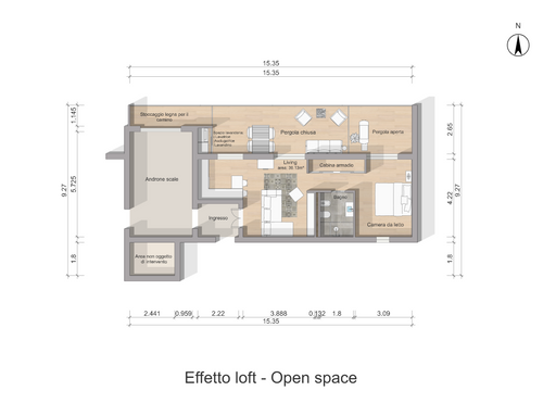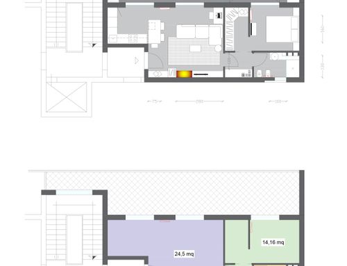 Delicious and exclusive environment. Minimal but not cold, which contains exclusive design pieces and in the meantime maintains maximum functionality. Creation of a pergola/bioclimate cover over the entire terrace, in order to enlarge the spaces of the living/living area and thus increase the use of the rooftop, making it perceptible from any part of the apartment. Where possible, make the most of the spaces also in order to always create useful containment (wardrobes) possibly respecting the standard measures that guarantee access to the cheapest solutions (Ikea and similar). The hypothesis of bioclimate pergolas imagines it with the possibility of leaving the terrace area in general but mainly the one in front of the bedroom, open in summer, to be used as such (barbecue, solarium, etc), and closed in winter; on the contrary, the area in front of the living room/kitchen, mostly closed but with the possibility of being open. I'd like to hypothesize a kitchen with an island/peninsula that is also useful for breakfast with support seating. Laundry area with washer/dryer column on the terrace in the bioclimate area in front of/on the side of the kitchen. Large comfortable shower. Bedroom also minimal. Hypothesis sofa bed for the living room of any couple of guests - without however detracting from the importance/elegance of the environment. Could a loft effect give something extra? ...in fact, I wouldn't rule out the possibility of a single environment - an open loft-like space, with the bathroom area dividing the sleeping area from the living area (the idea could be that of an apparently single environment with the sleeping area divided from the living area by the bathroom which looks like a single material block perhaps inclined as in the draft). I would also evaluate the presence of a FIREPLACE.