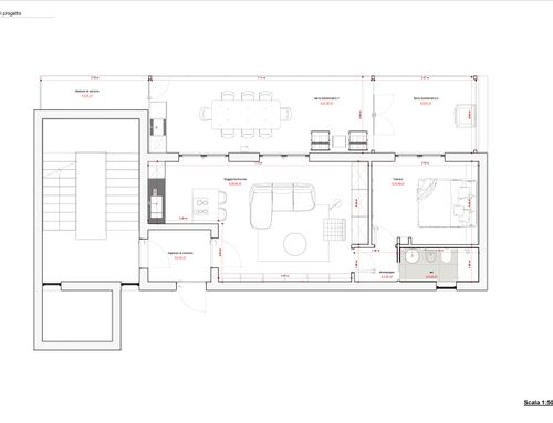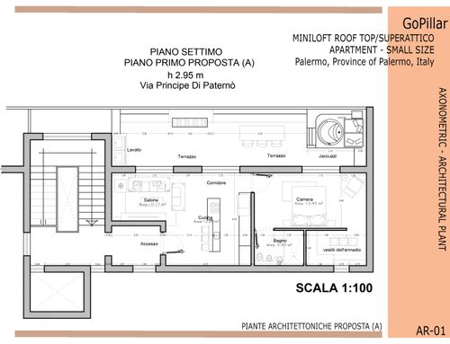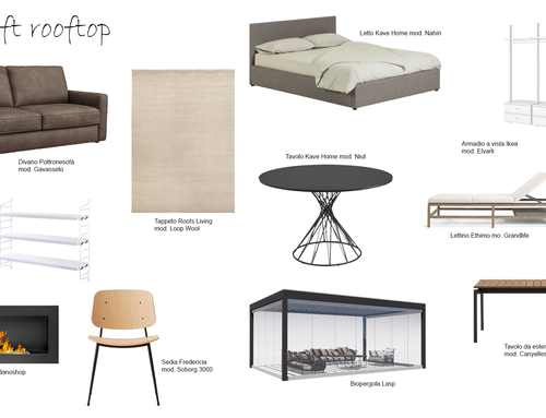 Ambiente sfizioso ed esclusivo. Minimal ma non freddo, che contenga dei pezzi esclusivi di design e nel frattempo mantenga la massima funzionalità. Realizzazione di una copertura pergole/bioclima su tutta la terrazza, in modo da allargare gli spazi della zona giorno/living ed aumentare così la fruizione del rooftop rendendolo percettibile da qualsiasi parte dell’appartamento. Ove possibile sfruttare al massimo gli spazi anche al fine di creare sempre utili contenimenti(armadi) possibilmente rispettando le misure standard che garantiscono l’accesso alle soluzioni più economiche (Ikea e simili). L’ipotesi delle pergole bioclima la immagina con la possibilità di lasciare l’area del terrazzo in generale ma prevalentemente quella di fronte la stanza da letto, aperta in estate, da sfruttare come tale(barbecue, solarium, etc), e chiusa in inverno; al contrario, la zona di fronte al soggiorno/cucina, prevalentemente chiusa ma con la possibilità di essere aperta. Mi piacerebbe ipotizzare una cucina con isola/penisola utile pure per la colazione con sedute a supporto. Zona lavanderia con colonna lava/asciuga in terrazza nella zona bioclima fronte/fianco cucina. Doccia grande e confortevole. Camera da letto anche minimal. Ipotesi divano letto per soggiorno eventuale coppia di ospiti - senza che questo però possa togliere importanza/eleganza all’ambiente. Un effetto loft potrebbe dare una marcia in più? ...infatti non escluderei la possibilità di un ambiente unico - spazio aperto tipo loft, con la zona bagno che divide la zona notte e la zona giorno (l'idea potrebbe essere quella di un ambiente apparentemente unico con la zona notte divisa dalla zona giorno dal bagno che sembra un unico blocco materico magari inclinato come in bozza). Valuterei anche la presenza di un CAMINO.