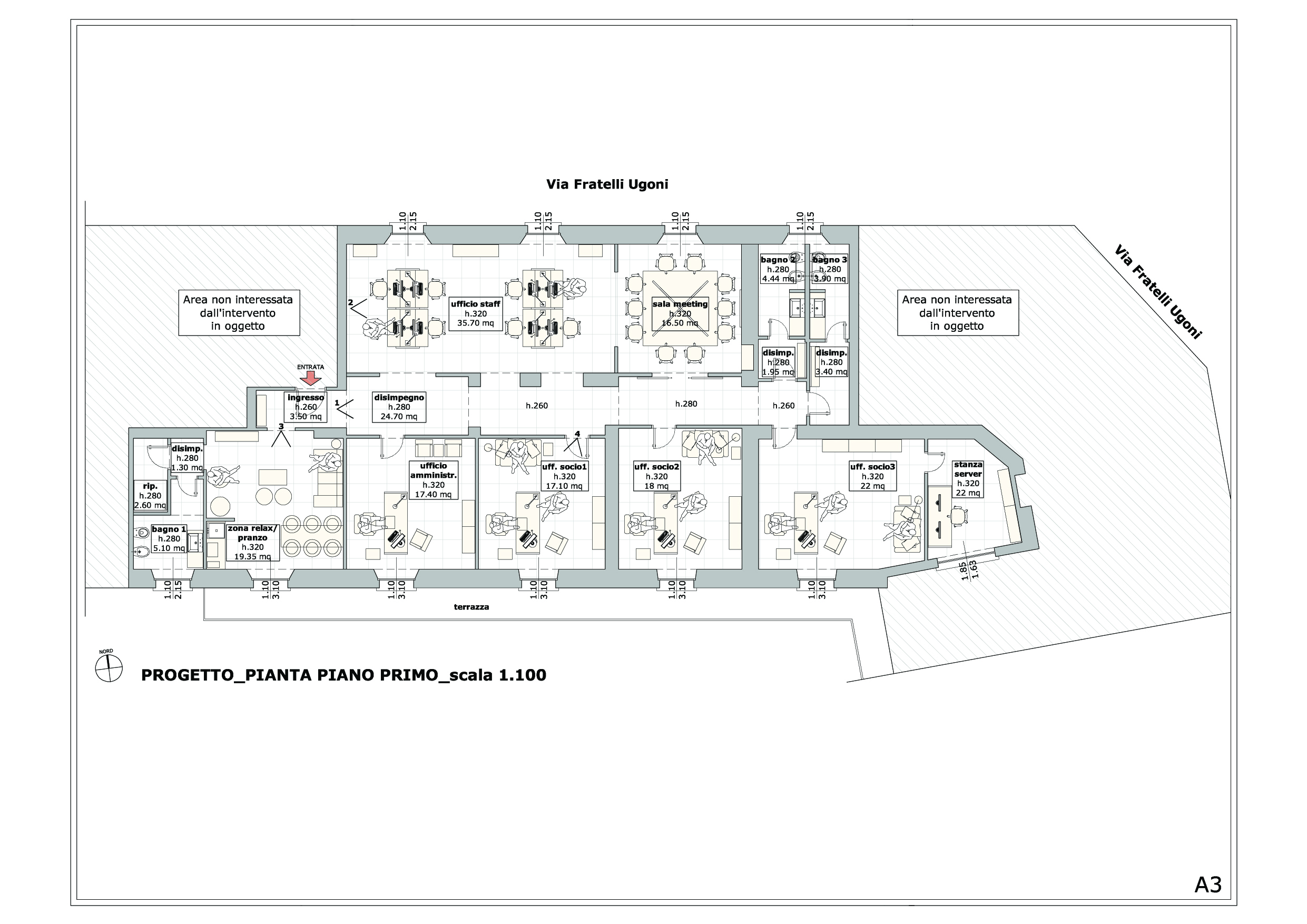 La nostra idea è dividere l'ufficio in due ambienti come si vede dall'immagine allegata. Nella zona più grande deve essere collocato lo spazio lavoro; ben accetto l'open space, 3 uffici distinti, aula riunioni e piccolo locale per alloggiamento server. Non si vogliono spostare i bagni ma solo ristrutturarli.