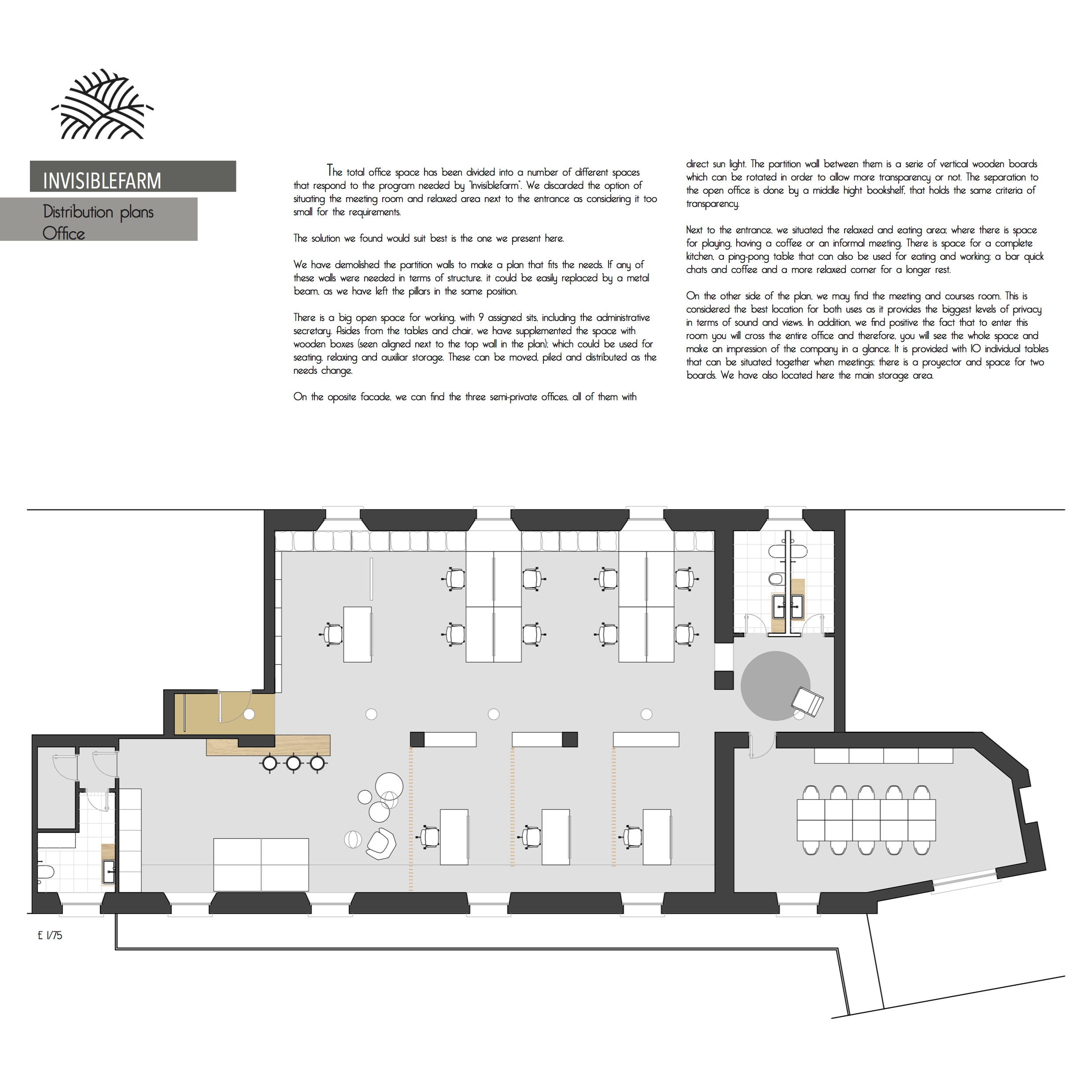 This office will be the new home of Invisiblefarm, a very innovative software company that works with open source technologies. The typical colors of the company are white and charcoal gray, and logo is a factory whith no contours, to leave space to the substance. Our motto is "Innovation transparent": we do everything is possible because our client continues to work and not being aware of our technical intervention, until its complete resolution. We are enterprising and engaged in research and development. Our office must reflect our philosophy: invisibility, minimalism and innovation. Our idea is to split the office into two environments, as you seen from the image attached. In the greater, should be placed the space work (we like the open space), 3 separate offices, a meeting room and smoll room for server bay. We don't want move the bathrooms, but only renovate its. The smaller area should be devoted to relaxation / play corner (dining, coffee area..), but it must also be converted into a work area in case of need. For reasons of architectural constraints, external openings can't be changed. We will use a floating floor under which the plants will pass.