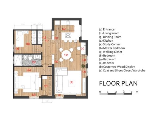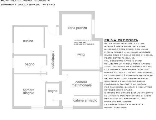 Salve a tutti ho un appartamento di 75mq ad un piano rialzato di una piccola palazzina: Vorrei ridistibuire gli spazi della zona giorno creando un ambiente spazioso e luminoso dove, se possibile, ricavare un angolo studio. Nella zona notte creare al posto del ripostiglio una cabina armadio o un secondo bagno e riorganizzare il bagno con una doccia più grande.
