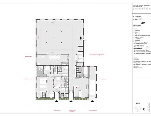 Il garage sarà collocato nell’angolo nord-est dell’edificio e collegato direttamente al laboratorio, per garantire la massima funzionalità alle operazioni legate alla produzione.