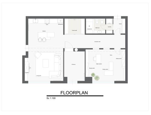 I own a commercial space of about 90 square meters, where I plan to open a store for mountain furnishings and supplies. The space has a central arched entrance door and two large arched display windows (each window measures 2.83 m).