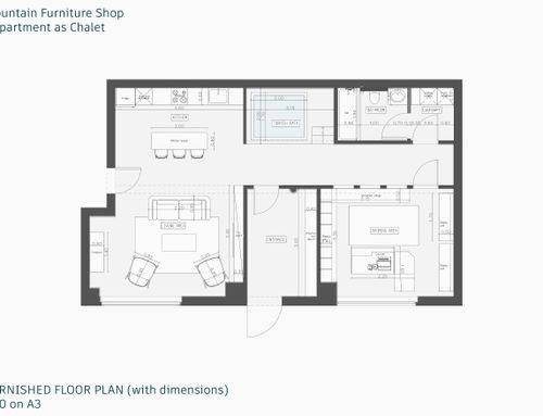 I also need to include a kitchen in chalet style with traditional elements that match the wooden ceiling panels (boiserie). The kitchen should include a small island for casual breakfast use.