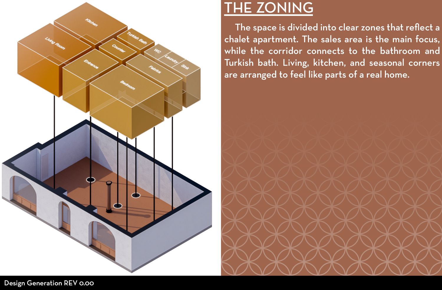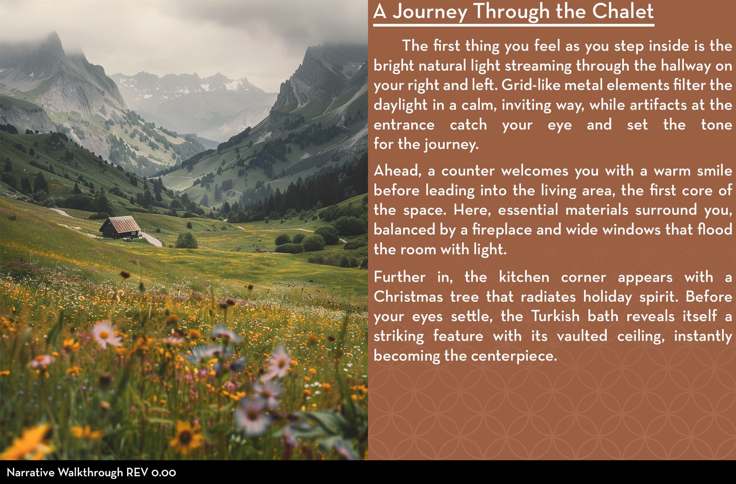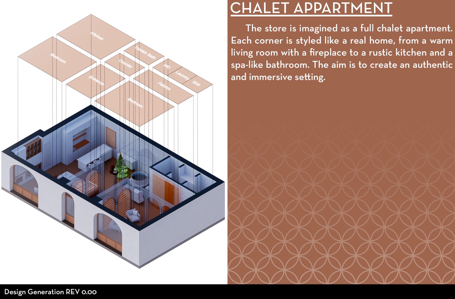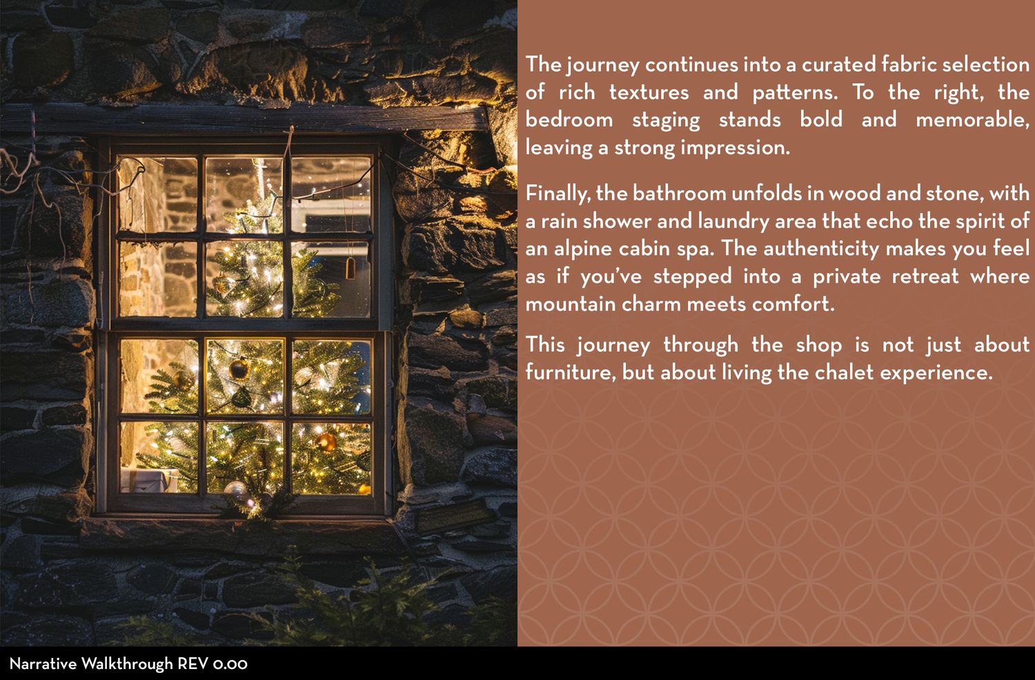 This project reimagines the furniture showroom as a journey through a mountain chalet. From the first step, natural light and crafted details set a welcoming tone, guiding visitors through spaces that feel both authentic and inspiring. Each zone unfolds like a story: a warm living area by the fireplace, a festive kitchen with holiday charm, a striking Turkish bath, rich fabrics, and bold bedroom staging. The path ends in a serene bathroom retreat, echoing the spirit of an alpine cabin. More than a showroom, it is an experience, inviting guests to feel the chalet life, not just see it.