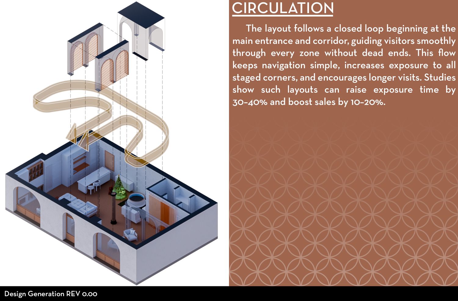 The showroom is crafted as both an experience and a sales engine. A closed-loop circulation increases product exposure by up to 30%, ensuring no corner is missed. Strategic lighting, calibrated to retail standards, can lift sales by 15–20% through clearer visibility and stronger focal points. Curated staging and narrative-driven zoning extend dwell time, which studies link to revenue gains of 20–40%. Together, these strategies create an environment where atmosphere drives emotion, emotion drives decisions, and design directly translates into profit.