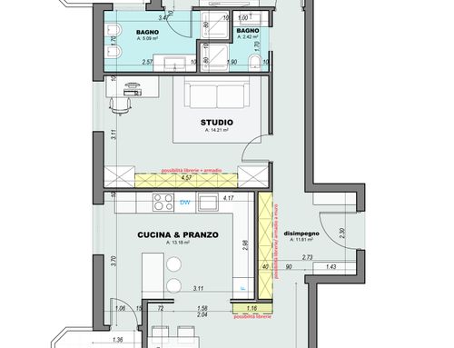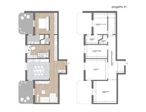 Salve a tutti. Ho un appartamento di 100 mq a Cagliari in zona residenziale in condominio. L'appartamento ha una unica esposizione a sud. Quindi tutte le finestre sono sulla stessa facciata sud. L'appartamento risulta molto luminoso. Si tratta di un trivano al primo piano. Avrei necessità di realizzare una zona living open space ma con una cucina non completamente open. Ho necessità di avere uno studio che all'occorrenza possa ospitare una o due persone al massimo. Al momento c'è un solo bagno, ma ho necessità di ricavarne due: uno padronale, con accesso direttamente dalla camera da letto matrimoniale e uno per gli ospiti. Pertanto il bagno per ospiti sarà senza bidet. Nella camera matrimoniale mi piacerebbe avere la cabina armadio. Nella terrazza della camera matrimoniale vorrei sistemare un ripostiglio in legno e fare la zona lavanderia possibilmente non visibile dall'esterno. Il mio stile preferito è il moderno-minimalista. La pavimentazione che amo di più è il parquet. Non amo le tinte forti se non in piccole dosi. Ad ogni modo ho dei mobili e arredi che vorrei utilizzare (tavolo bianco con gambe in alluminio, cassettone bianco con pomelli in alluminio (profondità 55 cm/larghezza 99 cm.), sedie similpelle grigie, divano rosso, comodini e tavolini Kartell, due casse altoparlanti). Ho bisogno di ricavare qualche armadio a muro per ricavare delle nicchie. Ho necessità di ricavare delle librerie in vari punti della casa ad esempio nell'ingresso, in soggiorno e nello studio. Grazie per l'aiuto!