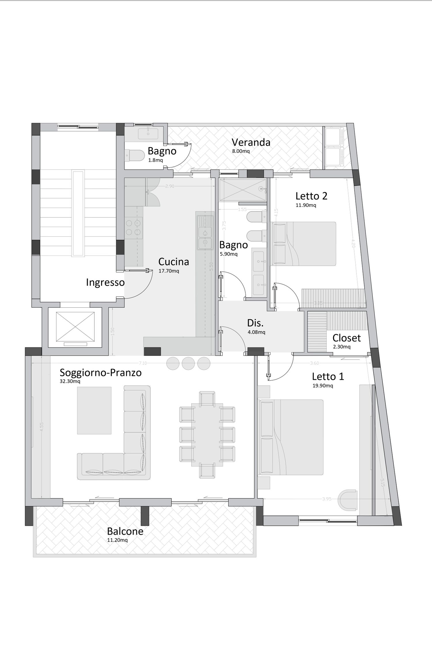 La proposta si basa su spazi aperti perfettamente illuminati e ventilati, mantenendo le pareti essenziali e aprendo gli ambienti. In questo modo si riesce a creare un’armonia tra gli spazi sociali e quelli privati, ampliando la cucina e organizzando meglio gli spazi del soggiorno e della sala da pranzo. Si propone un ridisegno del bagno esistente, riorganizzando la disposizione dei sanitari e sostituendo la vasca con una doccia. Alla camera principale viene aggiunta una cabina armadio e viene mantenuta una seconda camera per gli ospiti.