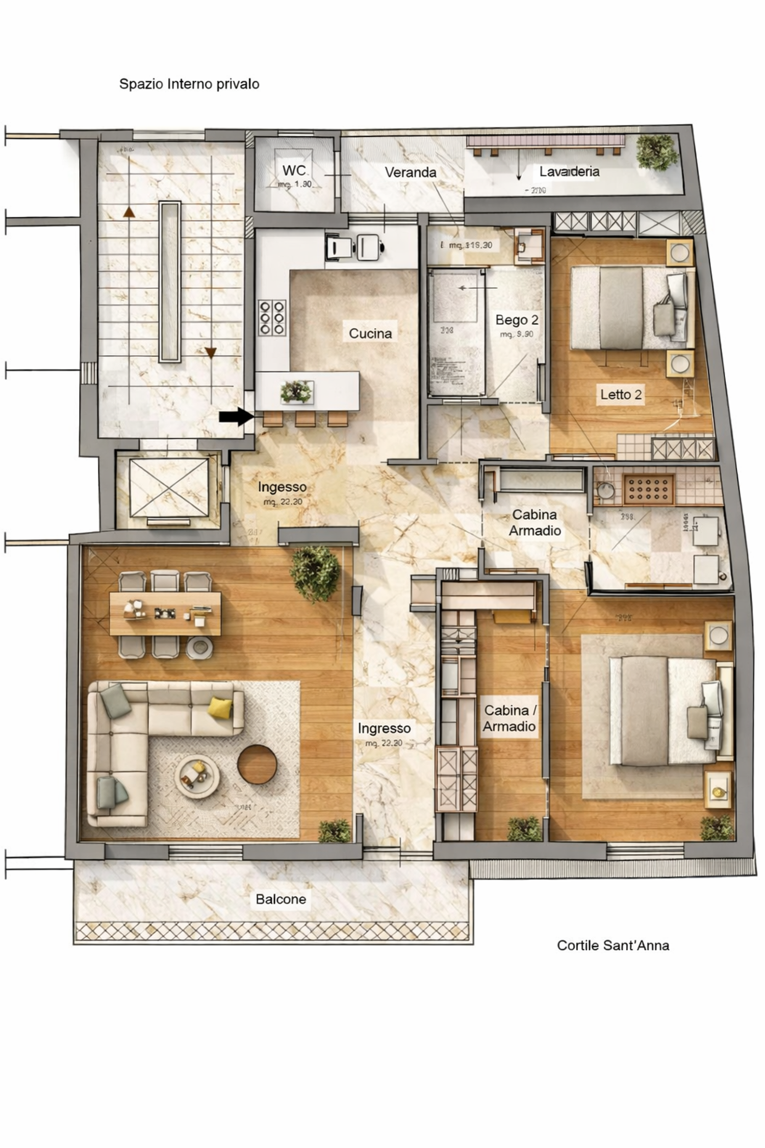 The overall spatial organization remains consistent with the existing plan, with a clear distinction between the day area and the night area. Circulation is improved through subtle adjustments to internal partitions and door alignments, enhancing usability without altering the architectural logic of the apartment.