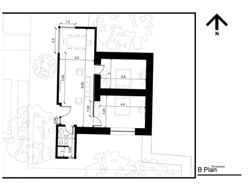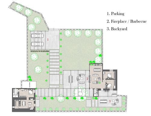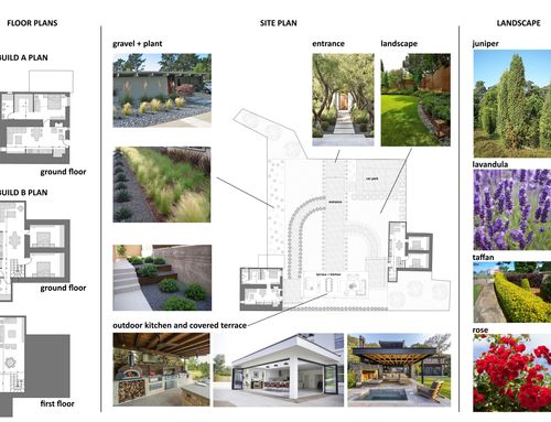 The plan shows 2 buildings, one of which (indicated with the letter A) in acceptable conditions internally, while externally it must be arranged; the other dilapidated (B), a stone cottage to be recovered, formerly served as a stable, consisting of 3 rooms as seen in the photos, the roof has collapsed so it does not exist. I would like to recover it by creating a stone structure for guests, like the cottages of the past, inserting a small bathroom, 2 bedrooms and a large living room, creating a mezzanine and skylights if possible. recovering the windows and inlets present in the stone walls, also enhancing the centuries-old oak placed in front of this building; in the center between the two buildings there is another tree. I would like to create a structure that can make the two buildings communicate, that separates the area in front of the buildings from that between the buildings, for example a covered and equipped shelter; ... a beautiful flower garden, partially paved, with natural walkable lawn, which reminds a little of the farmyard of the ancient farms, which has seats scattered in various points, a relaxation area, a car parking area. I'd also like to enhance the dry stone walls.