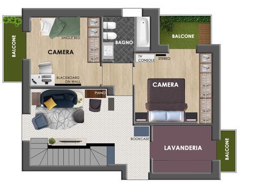 Hi all, I'd like to renew my night area. As you can see from the floorplan I have two sleeping rooms and a kind of dining room. In the dining room I already have a sofa, a table with a PC and in front a piano and another table with a TV. I would like to "renew" a bit also this area to be used as a relaxing place.
