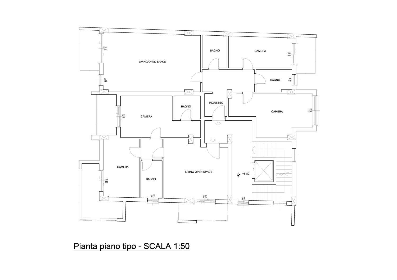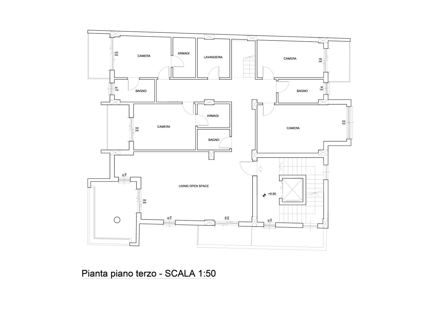 Concept per una ridistribuzione degli ambienti, eliminando le stanze troppo strette e anguste, e spostando i bagni che erano affacciati sulle zone giorno.