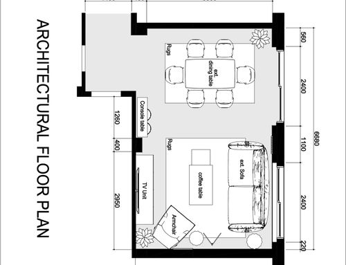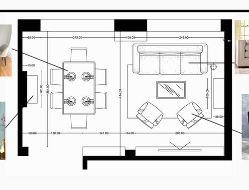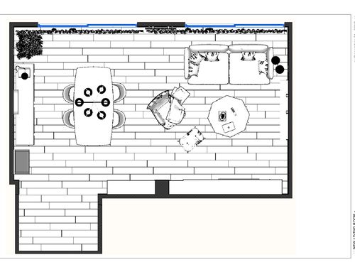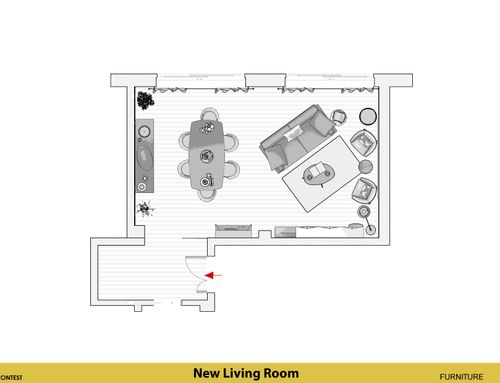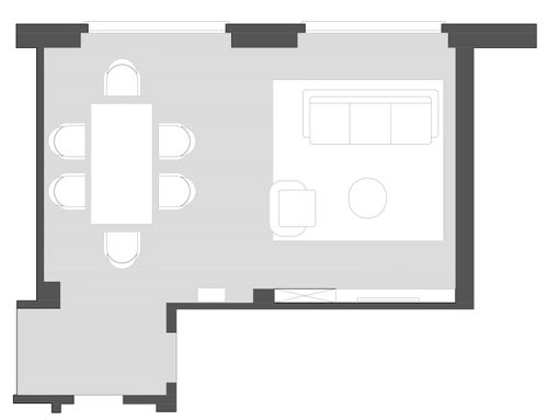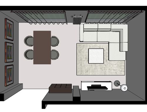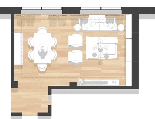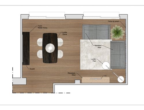 Vorremmo riprogettare la disposizione dei mobili ri-arredare il nostro salotto. Abbiamo già il divano, tavolo da pranzo. Vorremmo ricevere un design che possibilmente li includa ma con una migliore proposta di disposizione. A noi serve un' area ingresso, un' area dining ( tavolo e mobile contenitore) e un' area living per divani/poltrone e tv.