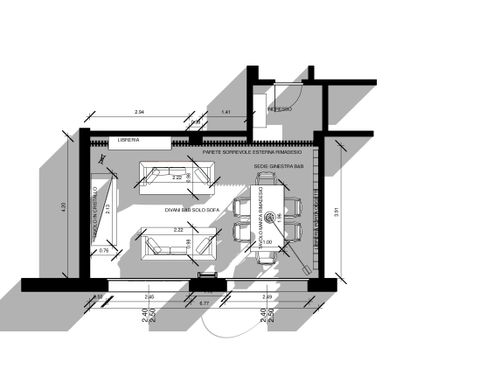 il lato lungo della stanza ha 2 grandi finestre scorrevoli che affacciano sulla terrazza. La stanza si affaccia all'ingresso principale . Abbiamo già alcuni elementi (Tavolo Rimadesio Manta 100x196cm top tovere termotrattato), sedie chiare (Meridiani, Odette), divano (Natuzzi Hherman - grigio, beige - 220x100)