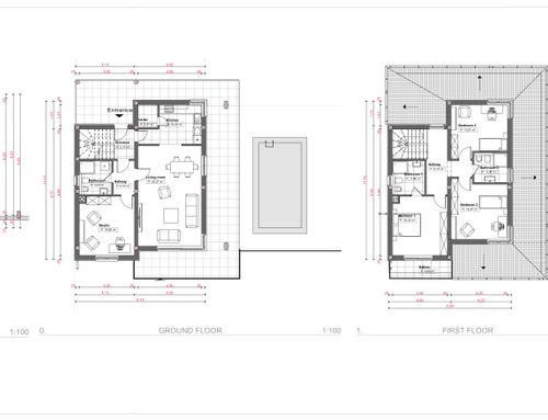 Hi all, I have a park where I would like to build a sample villa of the various ones to be built, for approximately 100 gross sq m MAX, not exceeding three levels, with adjoining commercial space and bathroom, the latter on a single level adjacent to the basement. The area is hilly and well exposed to the sun. I would like a modern and essential style with a large panoramic window overlooking the valley, with a porch and also the use of wood on the roof. living area with eat-in kitchen, living room and bathroom, sleeping area with three beds and en-suite bathroom each. Outside there is a parking area and a garden area with a small swimming pool or Jacuzzi always in front towards the valley or in any case exposed to the sun. I would like a style similar to the photo shown but as an example only. For the attic night floor but entirely practicable, I would like the recessed floor with a hallway that looks down on the day floor. Light colors for a modern style. Our area is colder so flat roofs should be avoided. You can ask for more info.