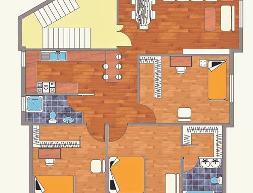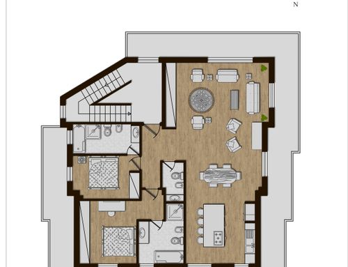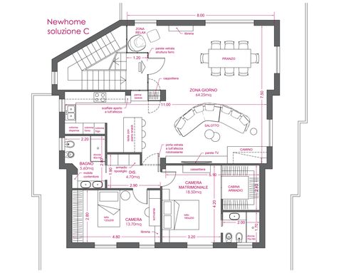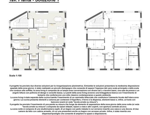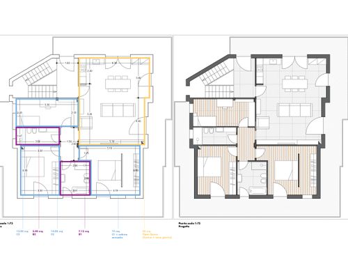 Hi, I have to reorganize the spaces of a first floor of a villa, they are about 140 square meters. I would like to reorganize the spaces, taking advantage of many bright environments and trying to focus daytime life in a living area - open space. I would also like to focus the space around a fireplace and have a walk-in closet. The brightest part (south) is that of the living room (29.12 m2). The arrangement of the fireplace is in the corner of the room (22.23 sq m) adjacent to the French window. A wall / partition with an entrance door must be created that separates the apartment from the lower floor and the attic (the stairs that go down and up cannot be moved)
