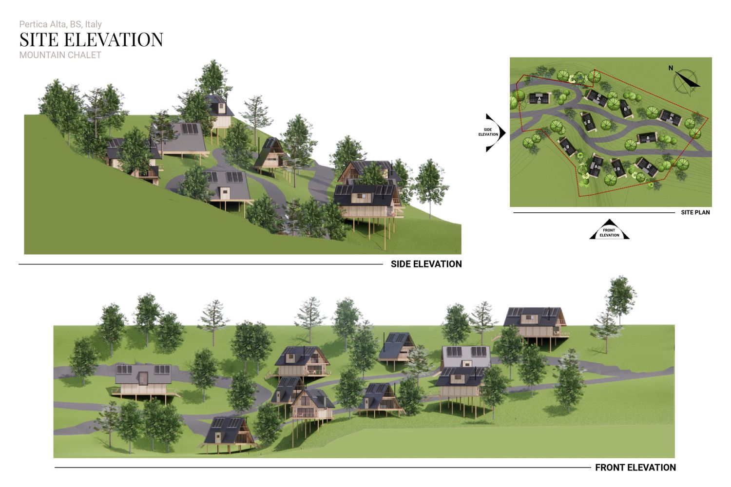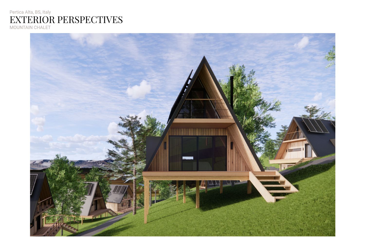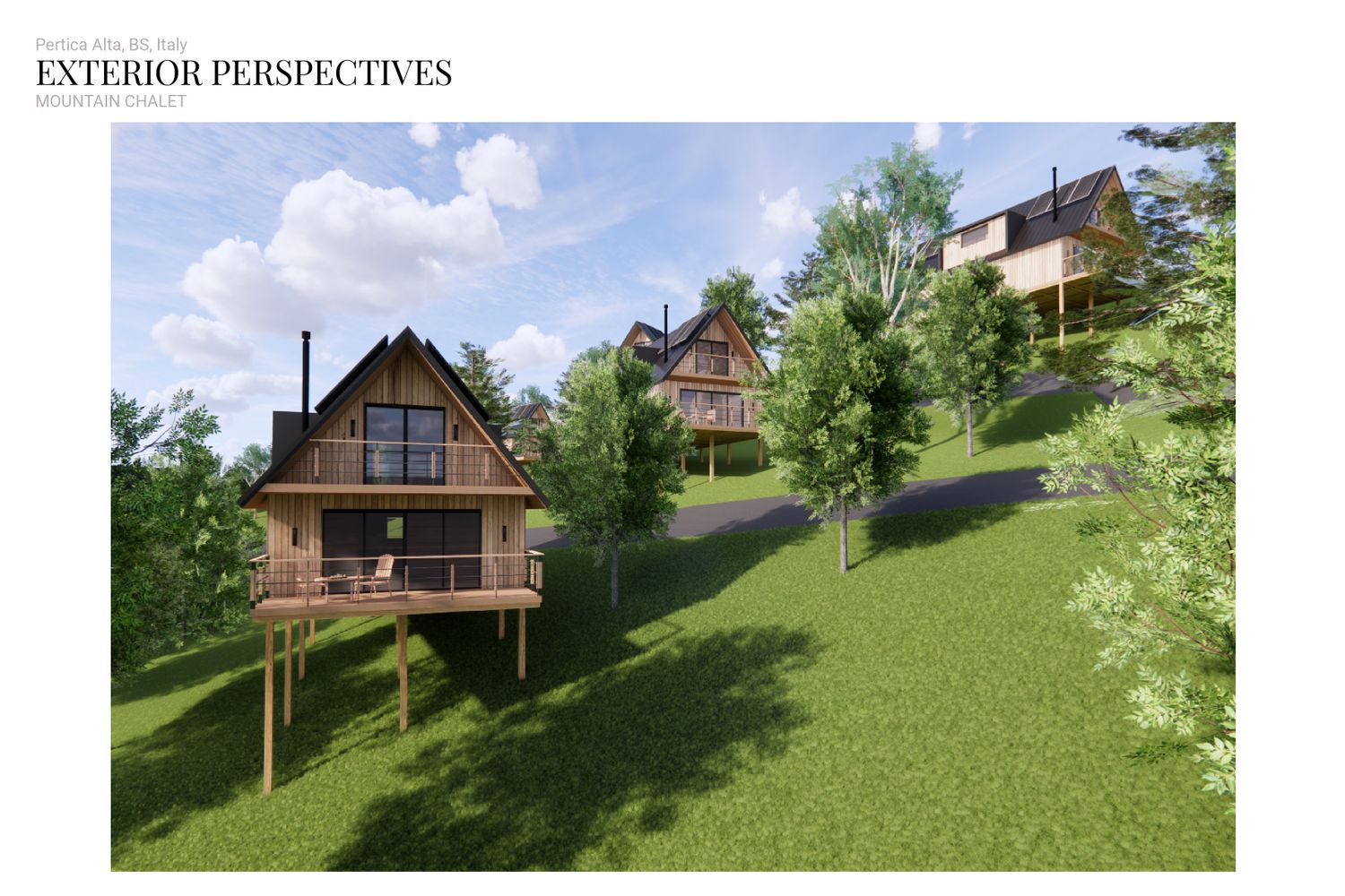 The concept responds to the client’s desire for compact, sustainable second homes in a mountain setting while ensuring privacy, comfort, and a strong connection to the natural landscape. he project aims to create a cluster of intimate, eco-friendly chalets that blend harmoniously with the mountain slope.