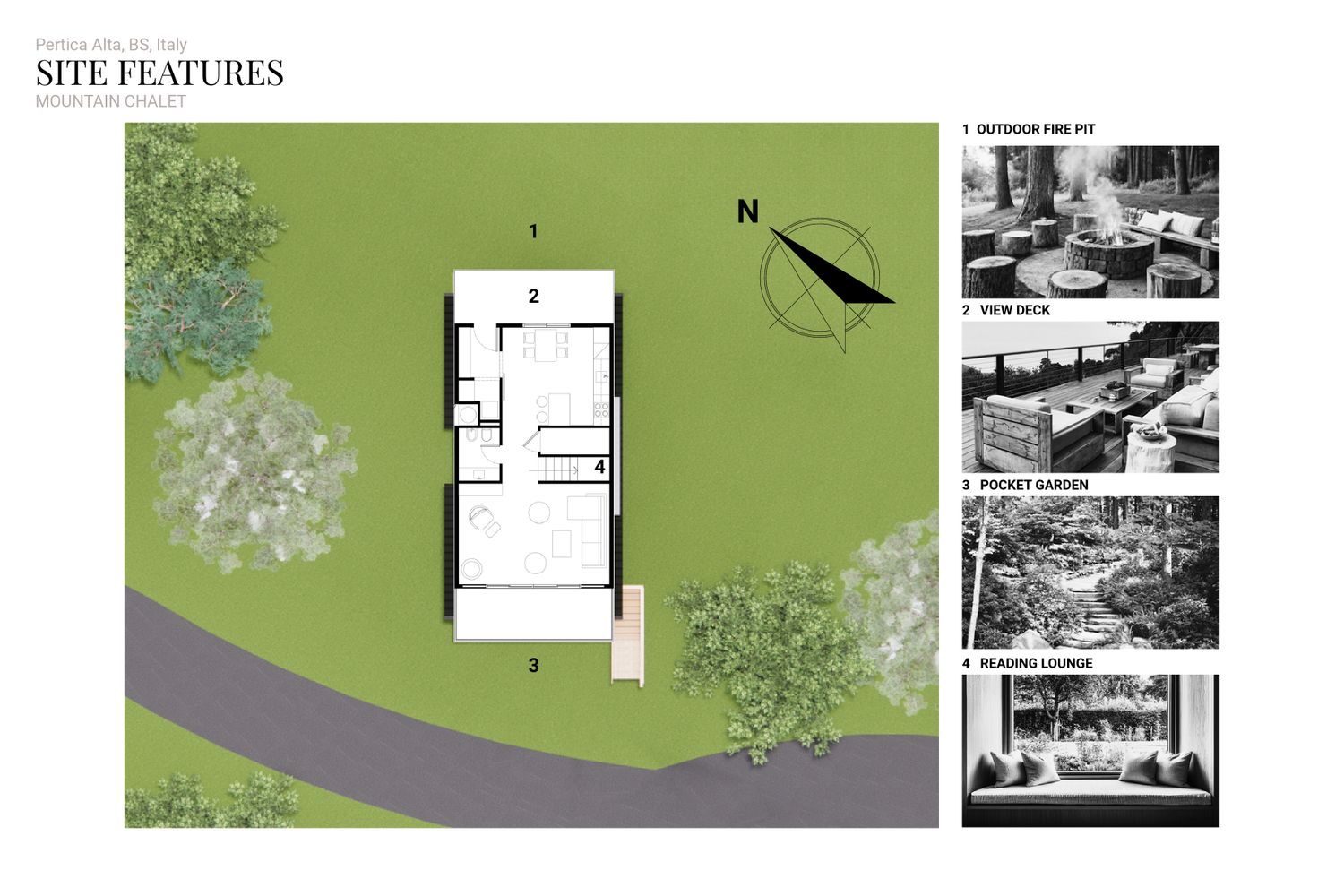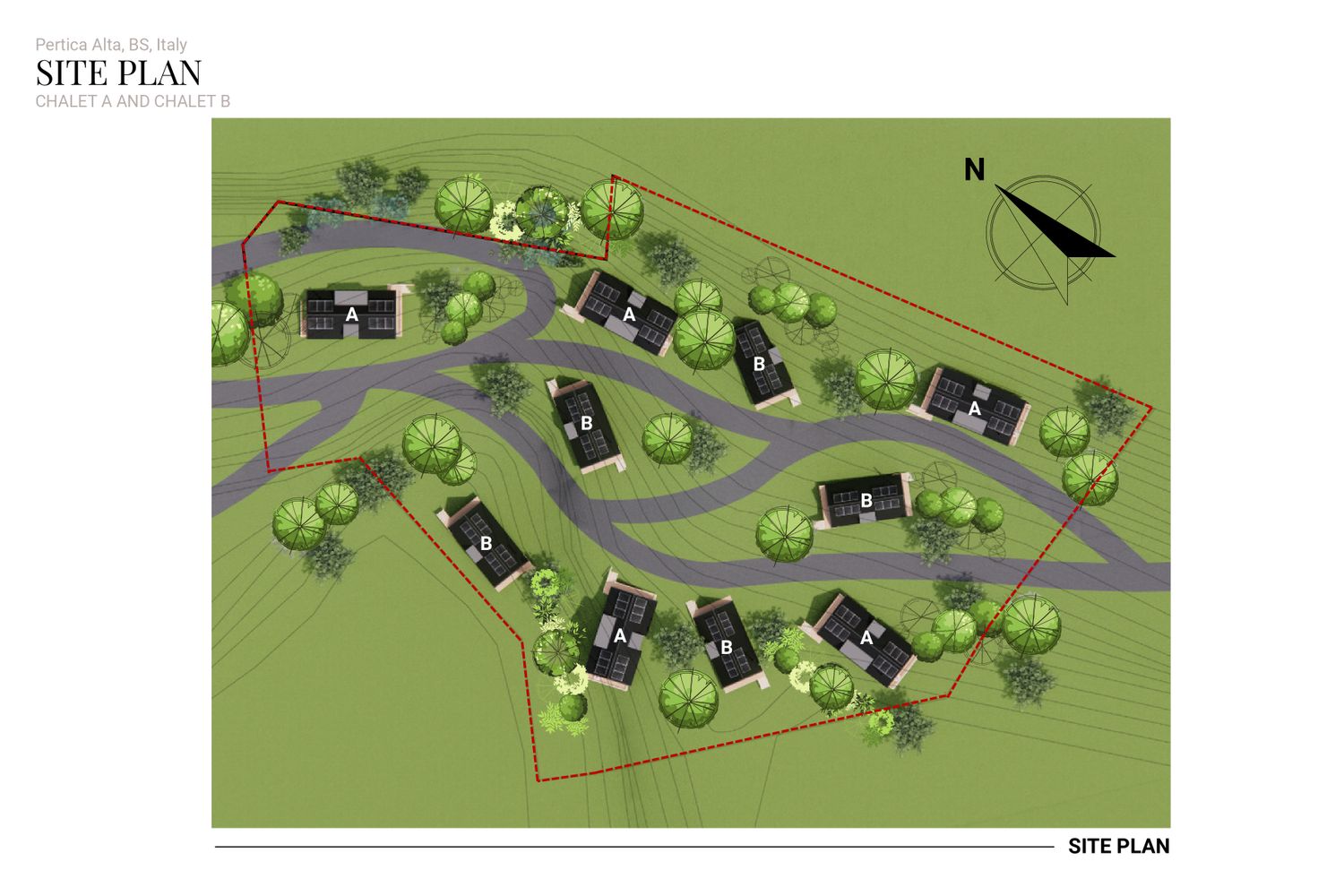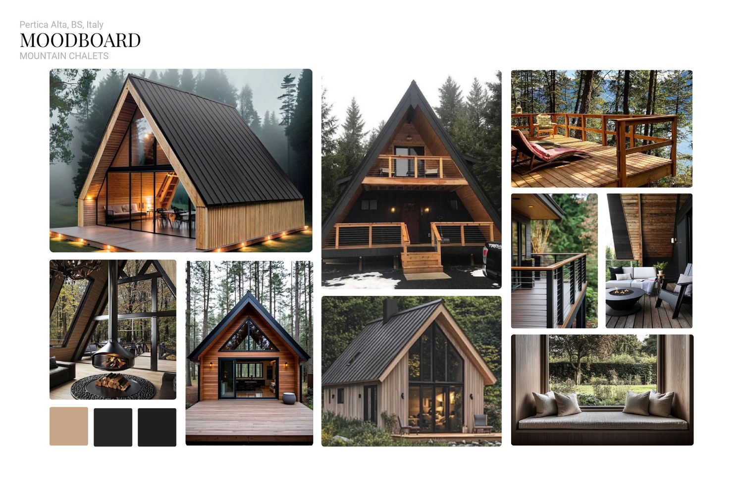 The concept responds to the client’s desire for compact, sustainable second homes in a mountain setting while ensuring privacy, comfort, and a strong connection to the natural landscape. he project aims to create a cluster of intimate, eco-friendly chalets that blend harmoniously with the mountain slope.