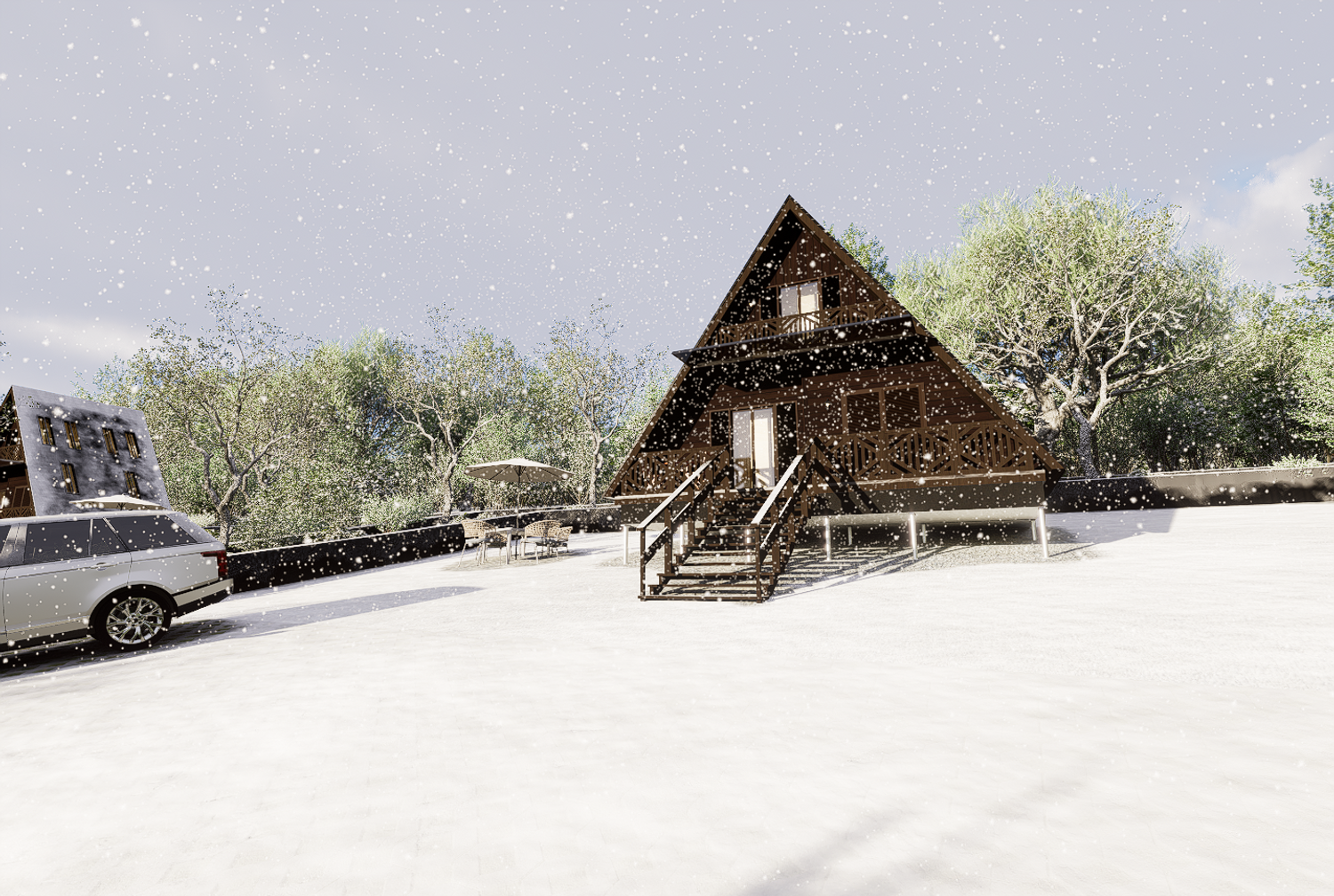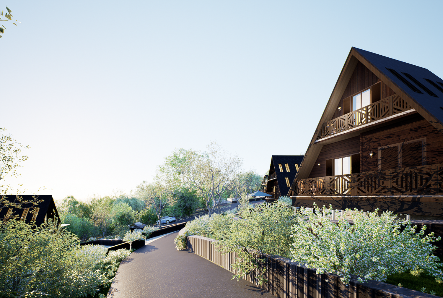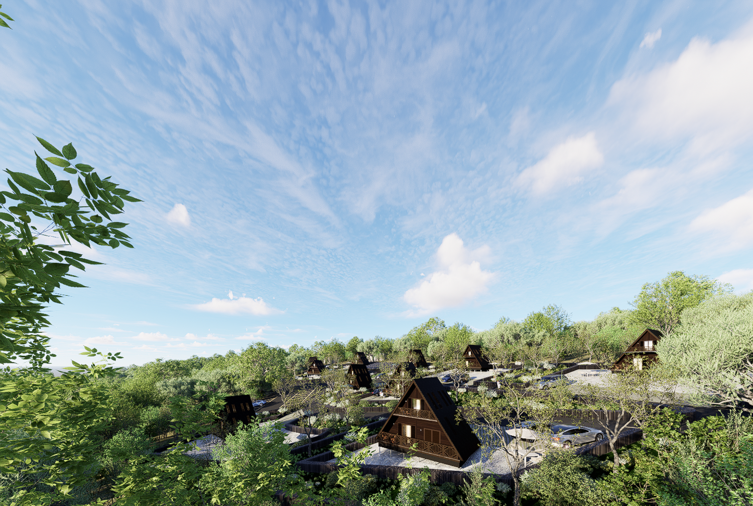 In questo progetto, il lotto è stato suddiviso in 10 unità, ciascuna destinata a ospitare una casa di montagna su pilastri, con dimensioni di 4,5 metri per 8 metri e un'altezza massima di 6,5 metri. Le abitazioni sono posizionate a una distanza superiore ai 5 metri dalla strada e a più di 10 metri l'una dall'altra, garantendo privacy e armonia paesaggistica.