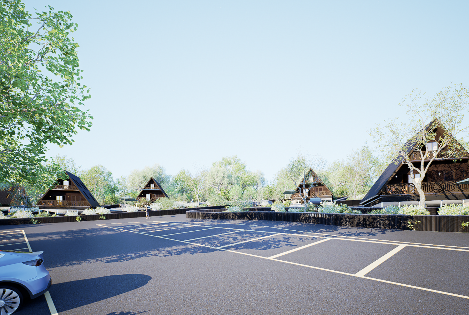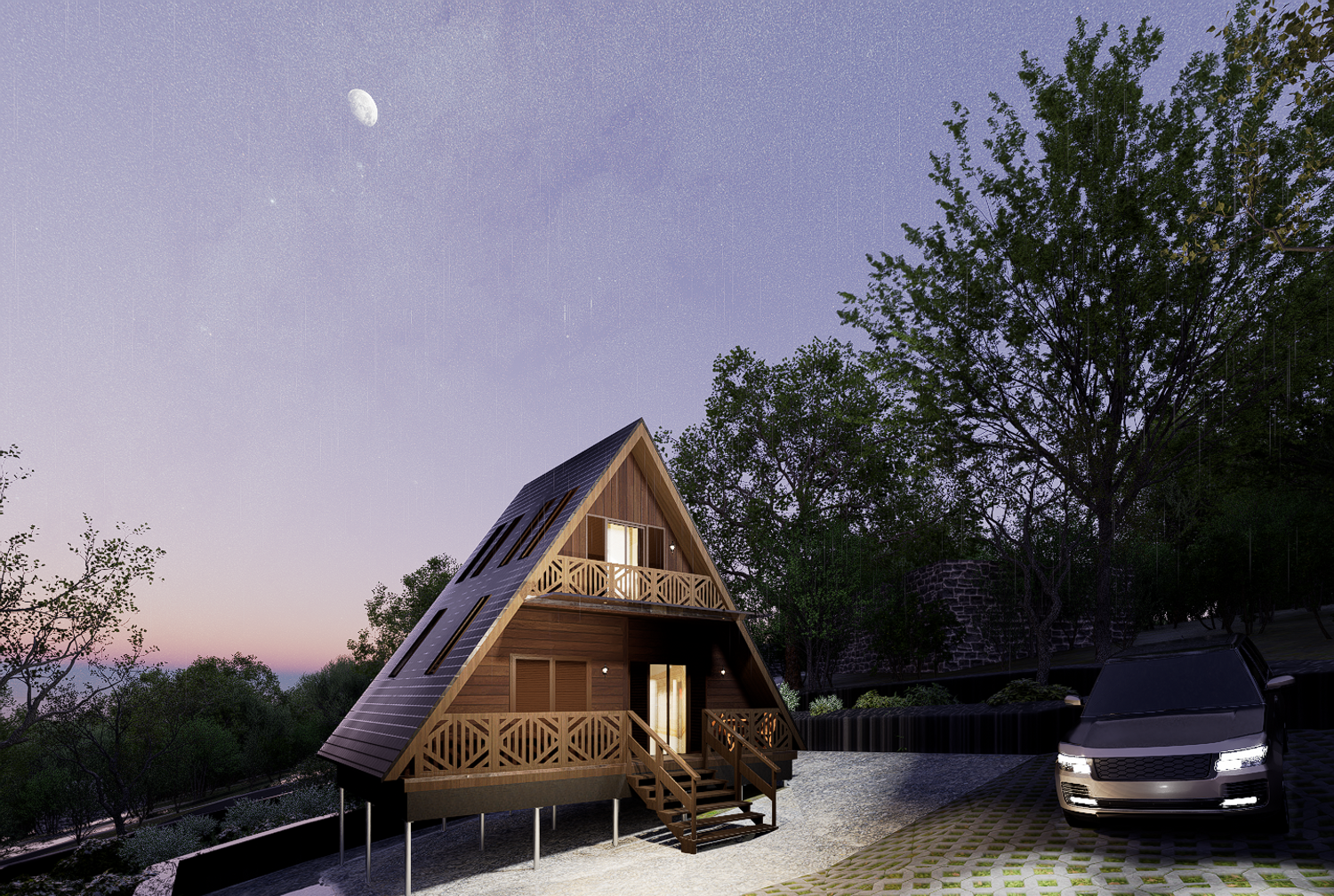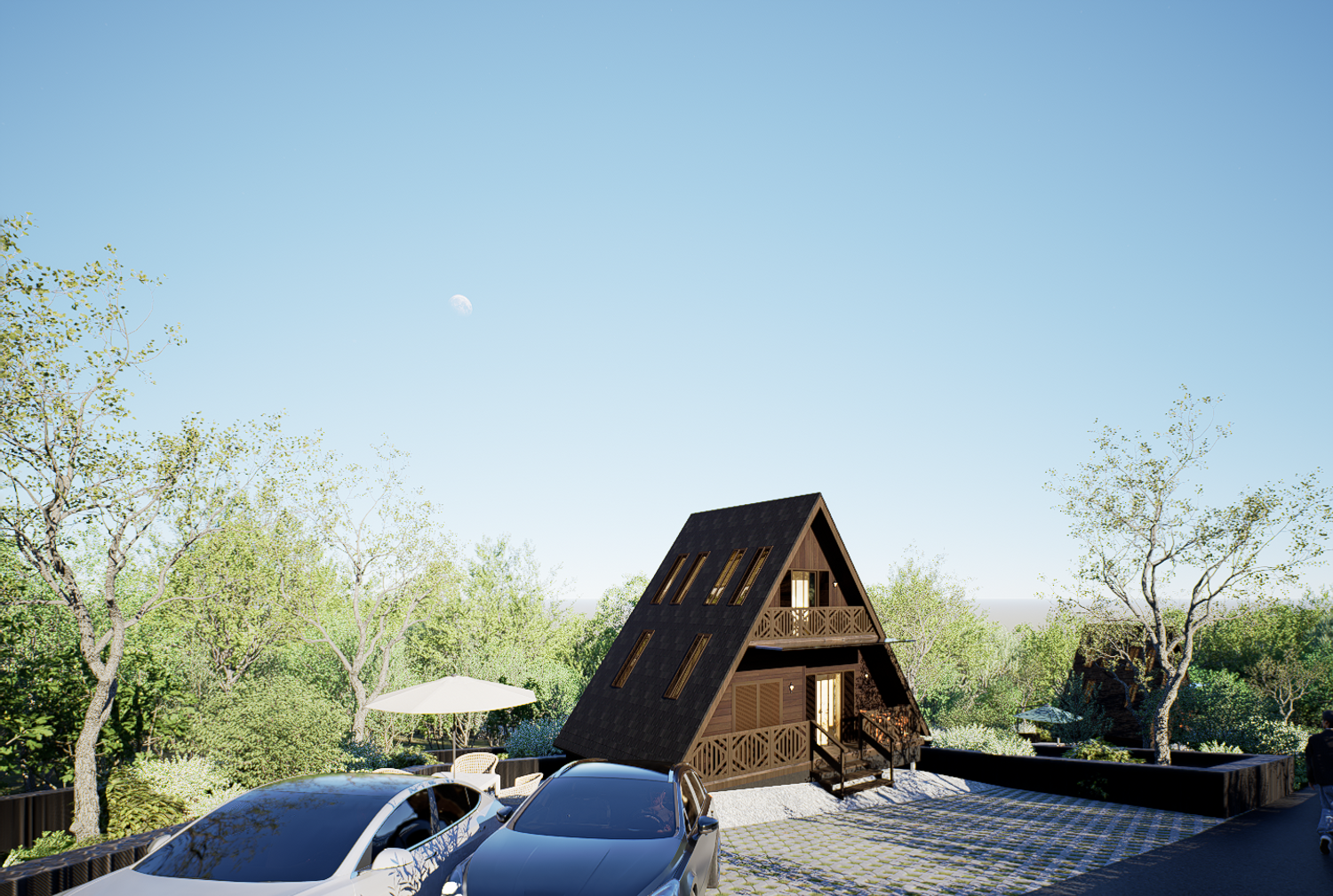 In questo progetto, il lotto è stato suddiviso in 10 unità, ciascuna destinata a ospitare una casa di montagna su pilastri, con dimensioni di 4,5 metri per 8 metri e un'altezza massima di 6,5 metri. Le abitazioni sono posizionate a una distanza superiore ai 5 metri dalla strada e a più di 10 metri l'una dall'altra, garantendo privacy e armonia paesaggistica.