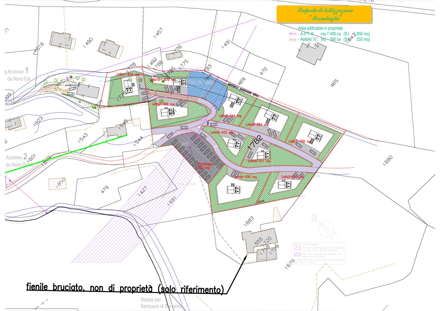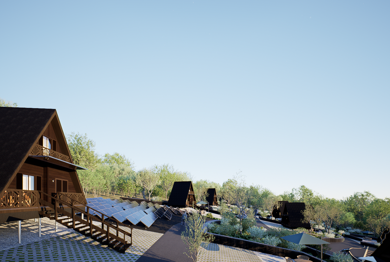 Nelle zone instabili si è scelto di realizzare aree di parcheggio e un mini parco fotovoltaico. In alternativa, queste aree possono essere destinate a spazi verdi, mentre i pannelli fotovoltaici possono essere installati direttamente sui tetti di ciascuna villa.