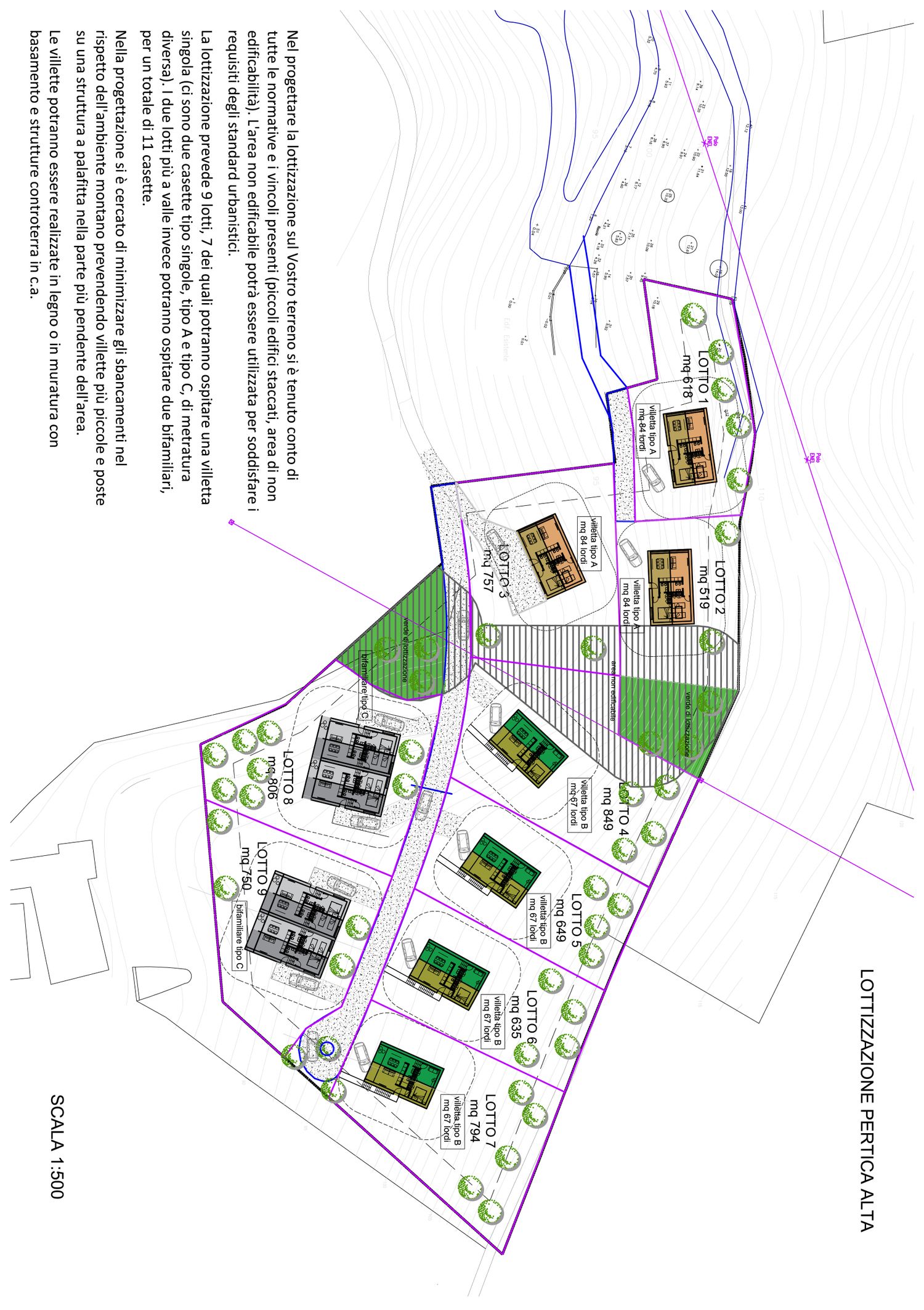 La lottizzazione prevede 9 lotti, 7 dei quali potranno ospitare una villetta singola (ci sono due casette tipo singole, tipo A e tipo C, di metratura diversa). I due lotti più a valle invece potranno ospitare due bifamiliari, per un totale di 11 casette.