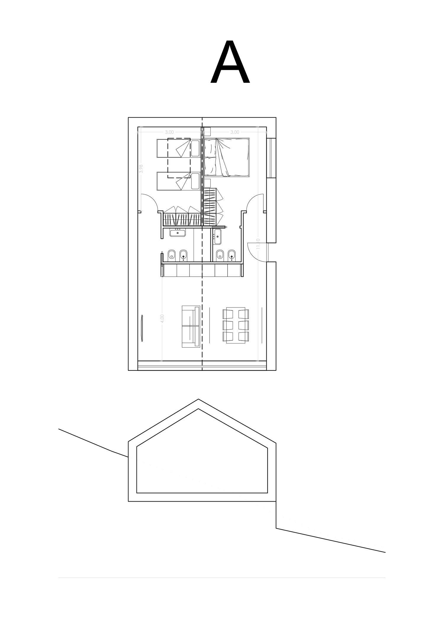 posta longitudinalmente sul pendio, tetto a capanna con vetrata in testa.