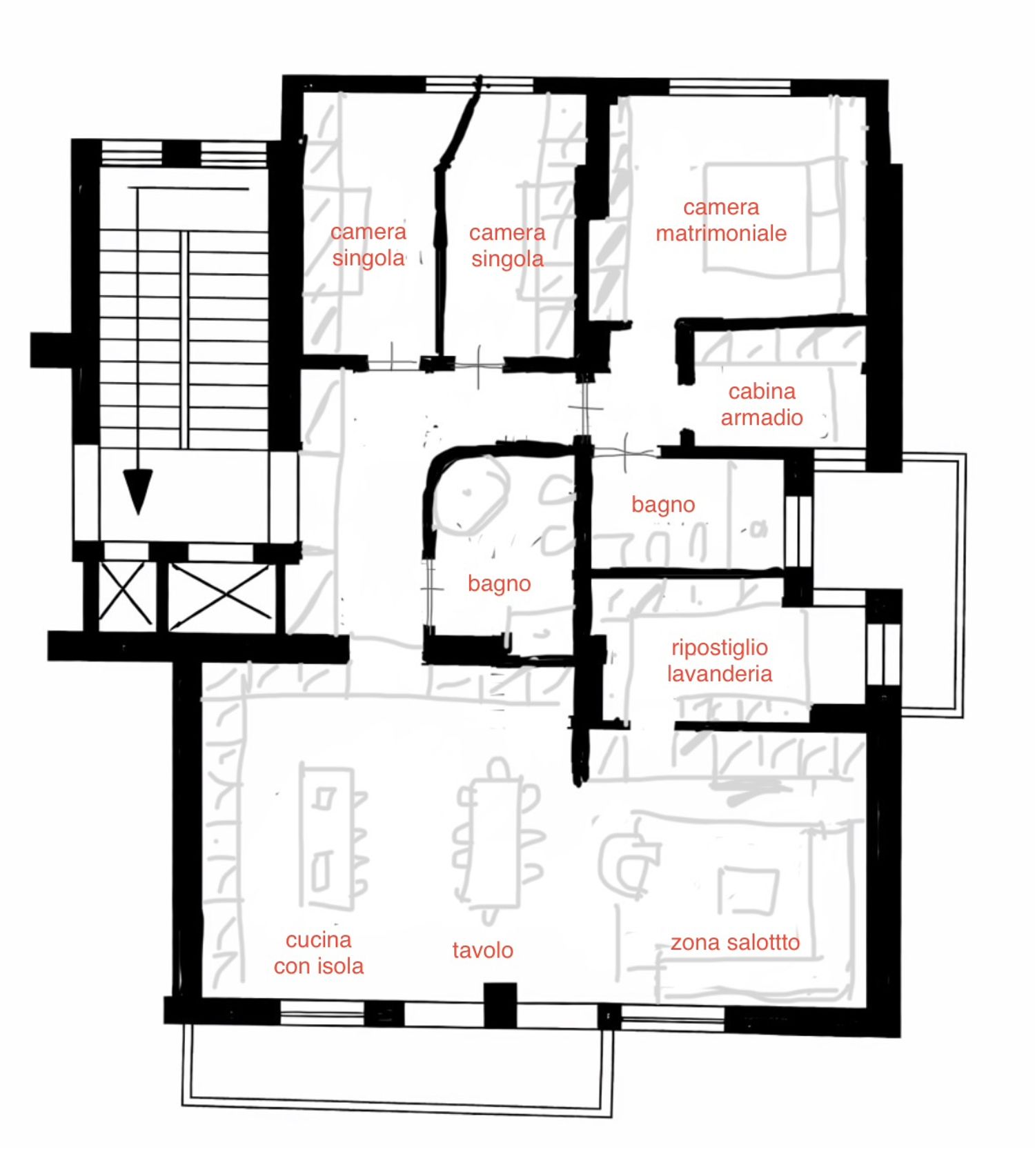 la prima camera esistente viene suddivisa in due camere singole, mentre l’altra stanza diventa una master bedroom, uno spazio più intimo e riservato, dotato di bagno privato e cabina armadio finestrata, pensata come ambiente funzionale ma anche piacevole da vivere.