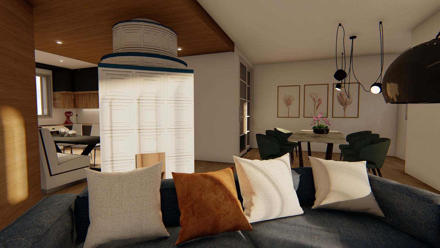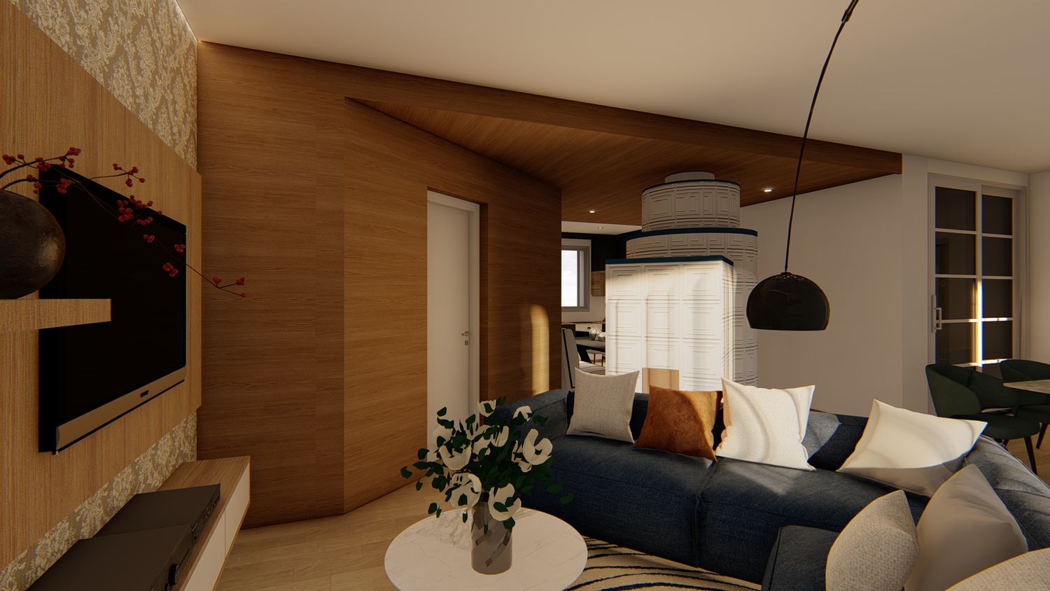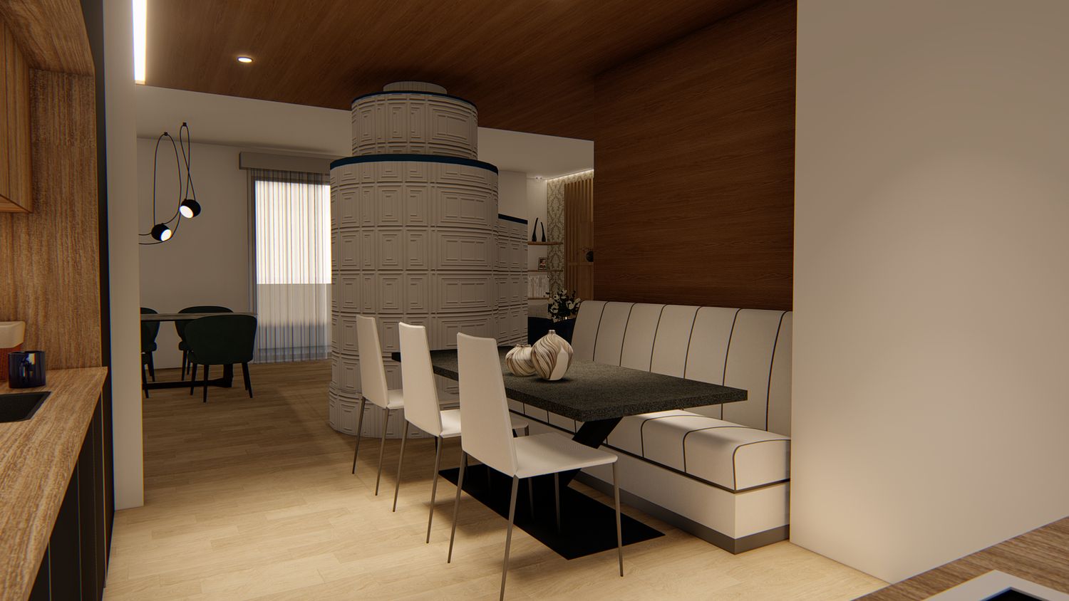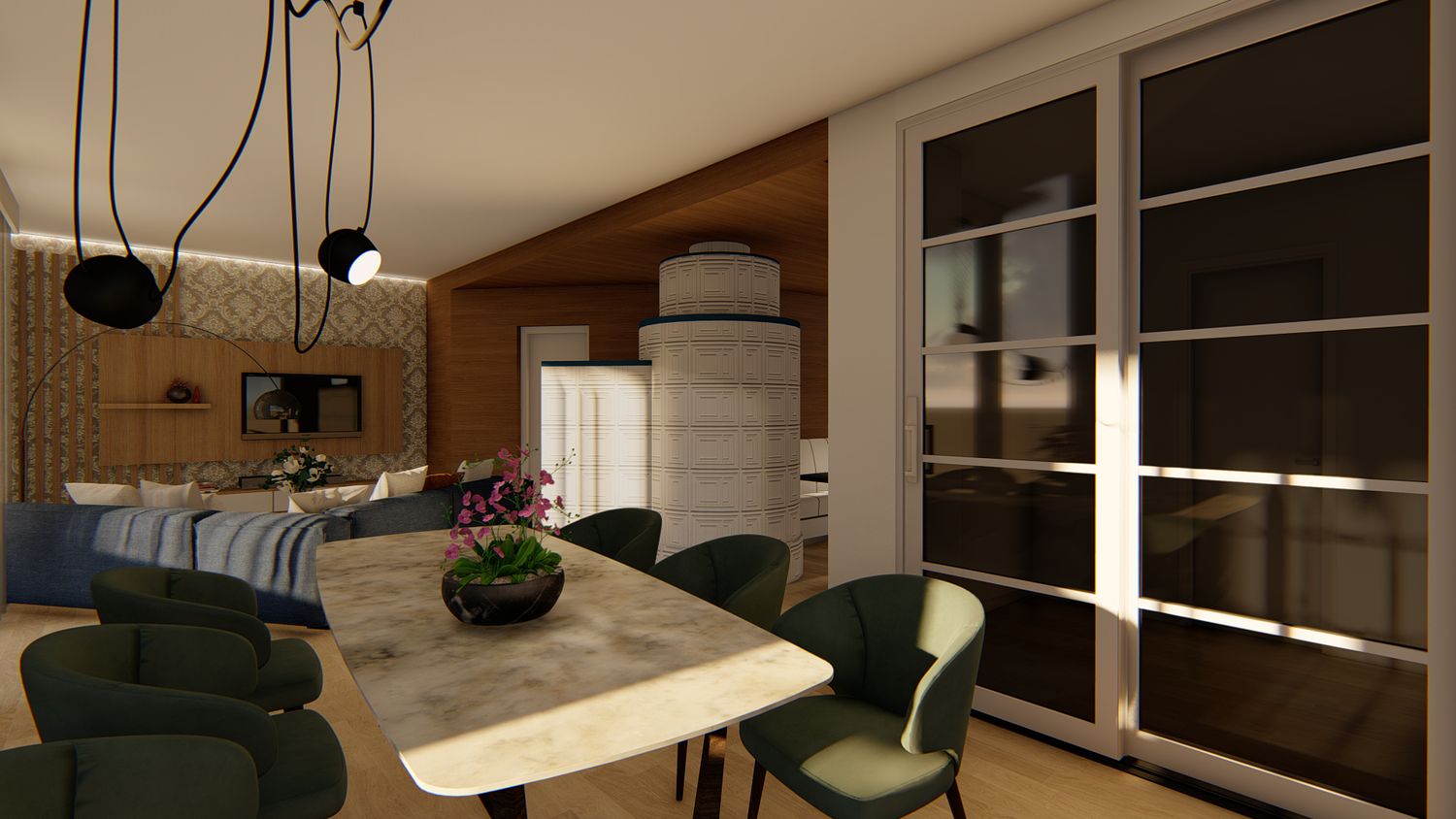 contemporaneo e minimale, con ampia cucina dal gusto montano e linee pulite. Accenti di chic nella parete damascata, e una boiserie che abbraccia l'area colazione includendo anche il profilo della trave. Qualche piccola variazione nella scelta delle luci, preferendo faretti incassati sulla boiserie e in cucina, luce indiretta per la parete TV, ed una lampada di design per la zona pranzo