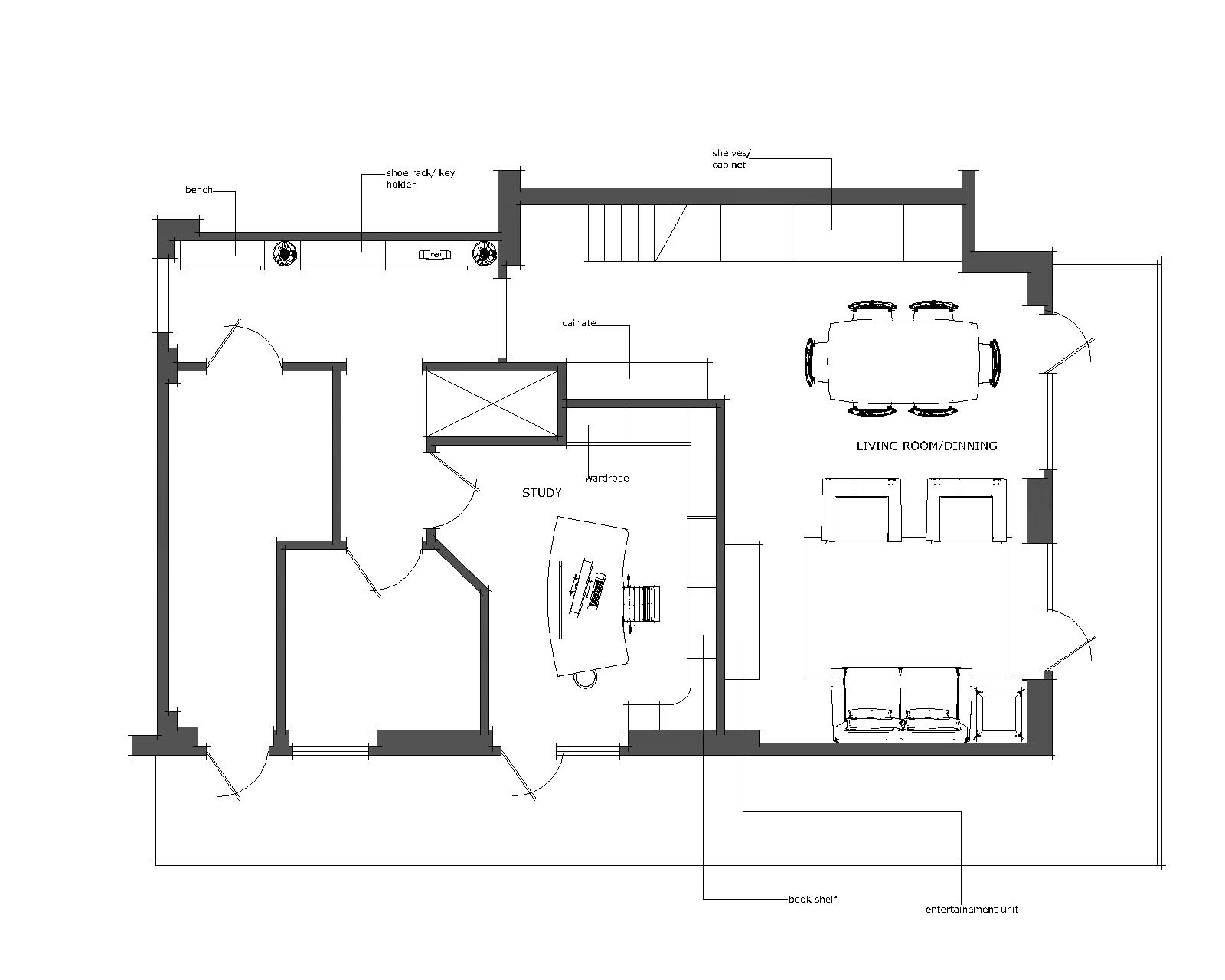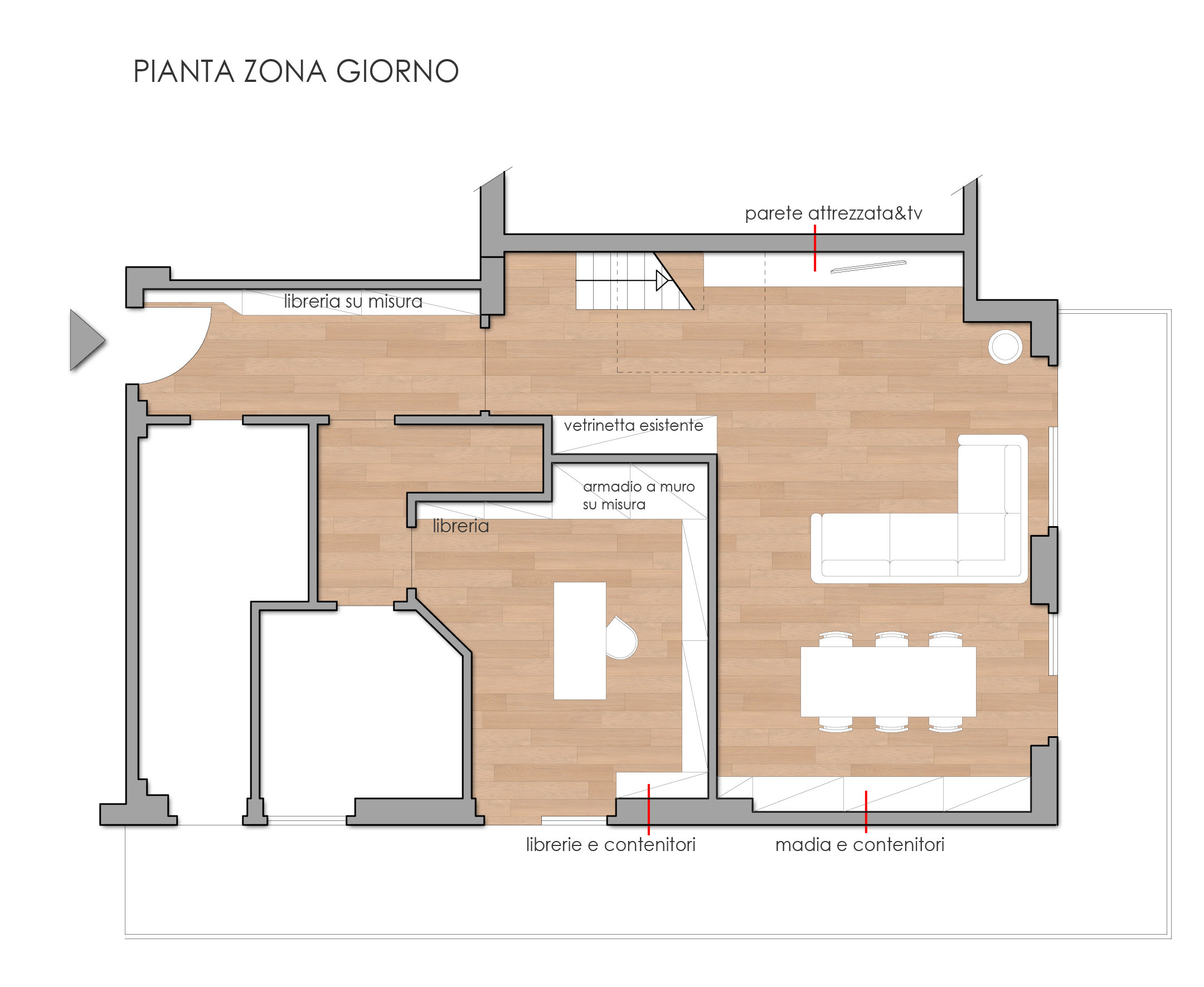 6. la stanza che serve come studio ha bisogno di librerie su misura e anche di uno spazio chiuso (armadio) per collocare i nostri capotti e quelli degli ospiti, di un’ampia scrivania.